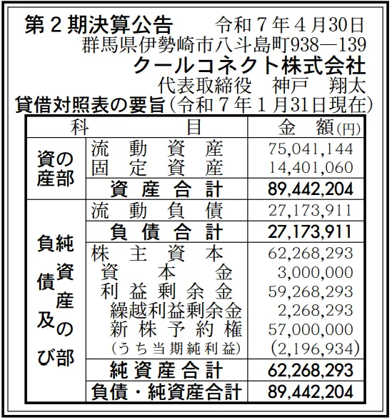 クールコネクト株式会社の過去の決算一覧