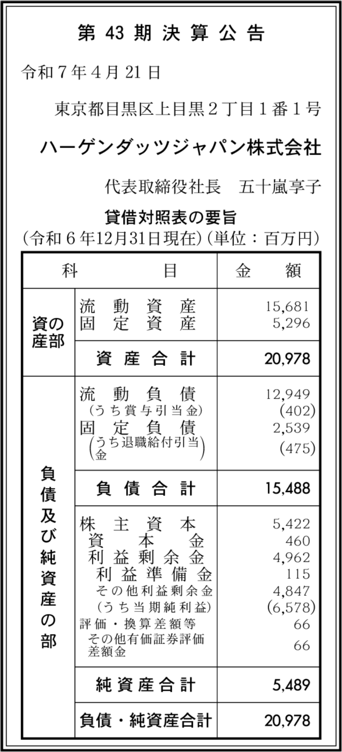 | 法人名 | ハーゲンダッツジャパン株式会社 |