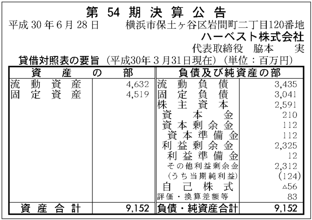 | 2018年03月31日 | 54期 | 1億2,400万円 | 23億2,500万円 | 91億5,200万円 |