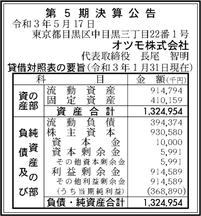 | 2021年01月31日 | 5期 | 3億6,889万円 | 9億1,458万9,000円 | 13億2,495万4,000円 |