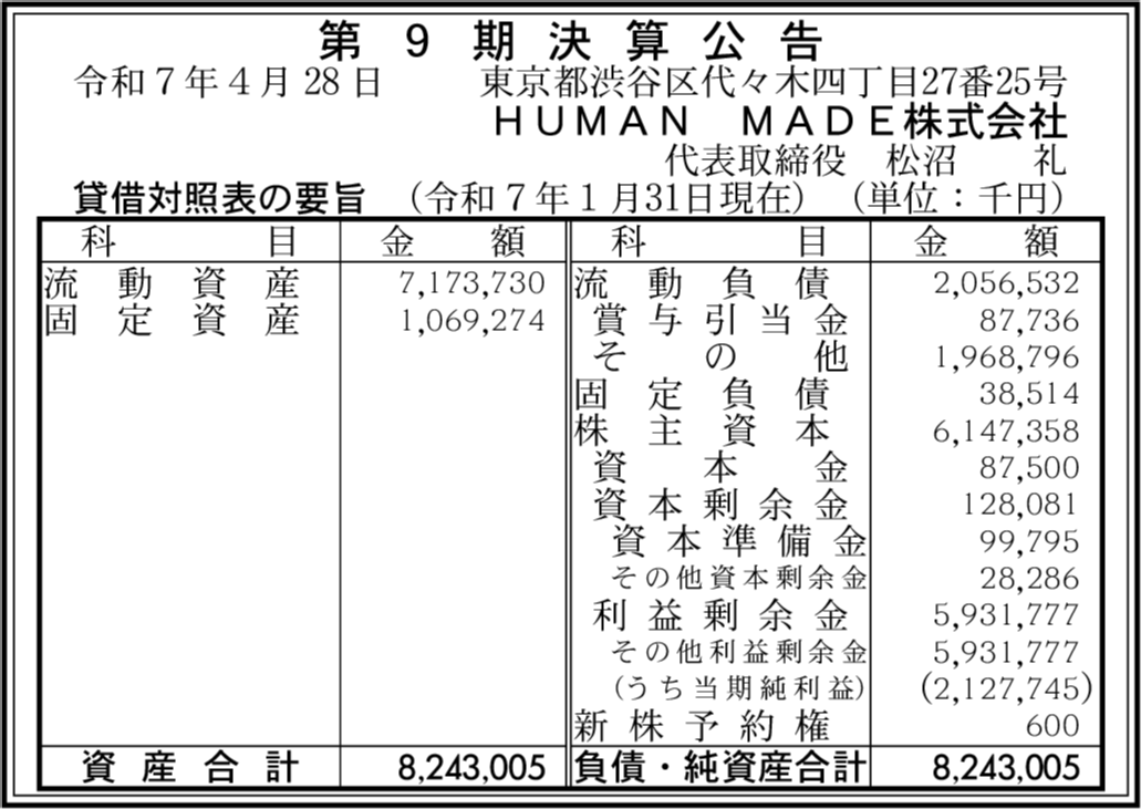 | 2025年01月31日 | 9期 | 21億2,774万5,000円 | 59億3,177万7,000円 | 82億4,300万5,000円 |