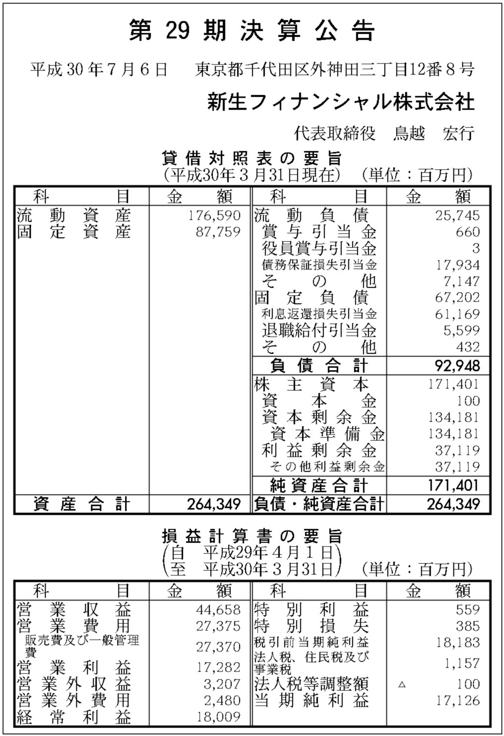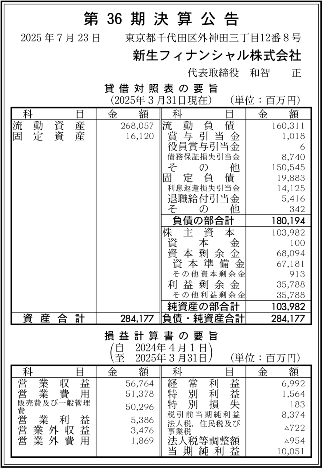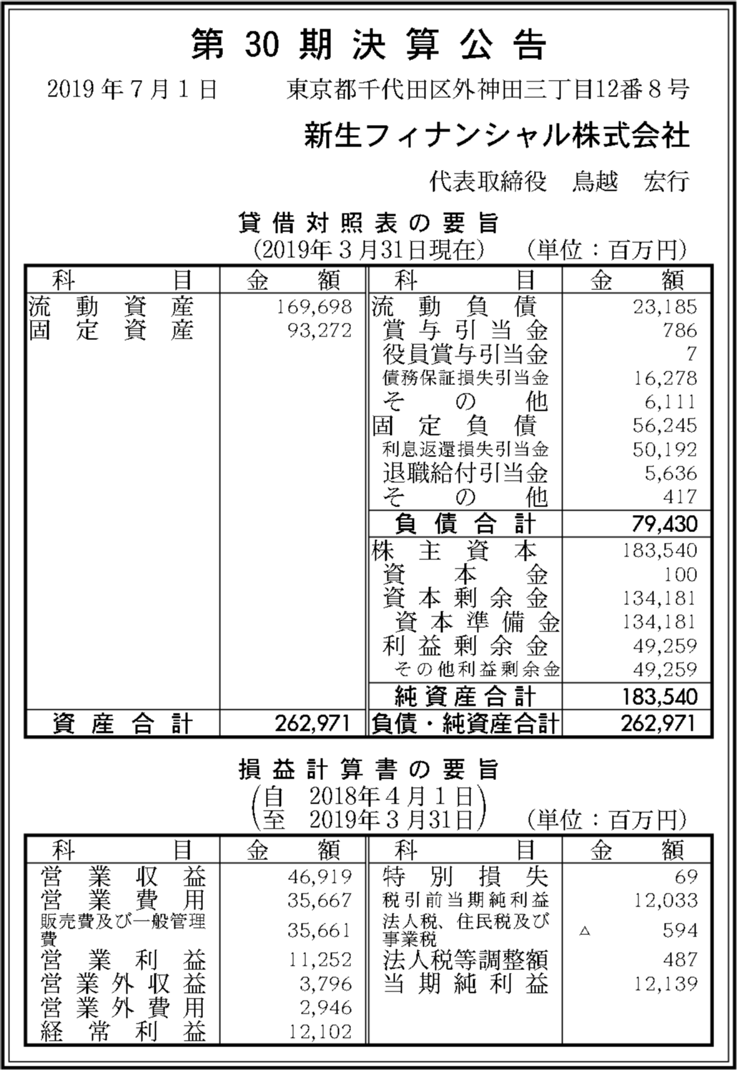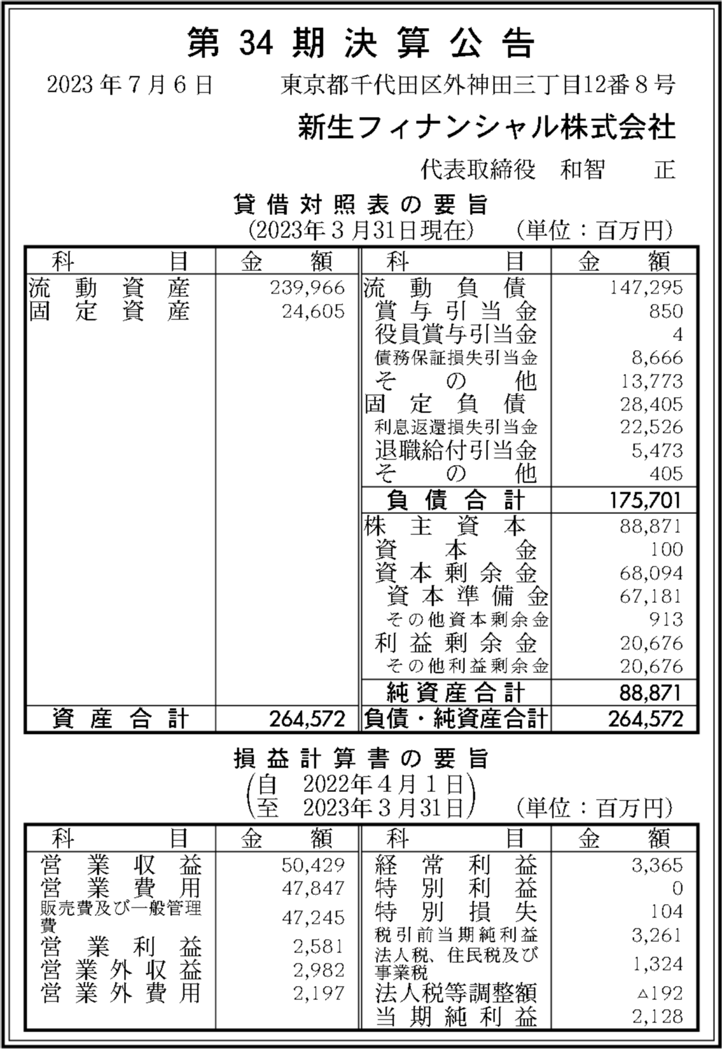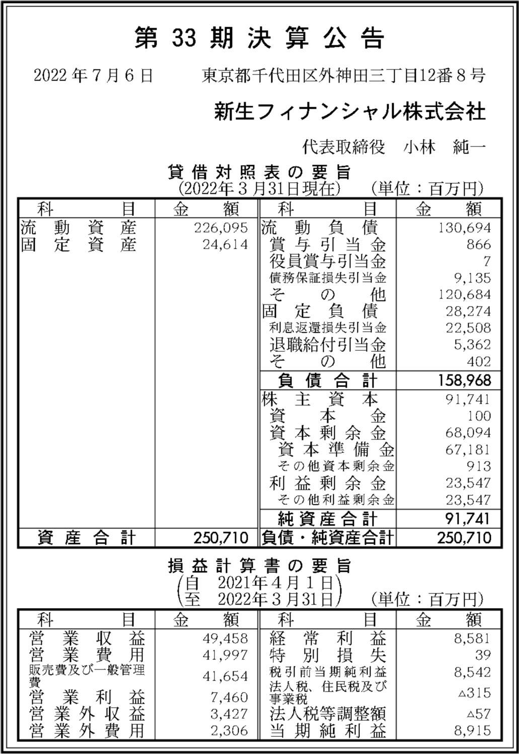 新生フィナンシャル株式会社の過去の決算一覧
