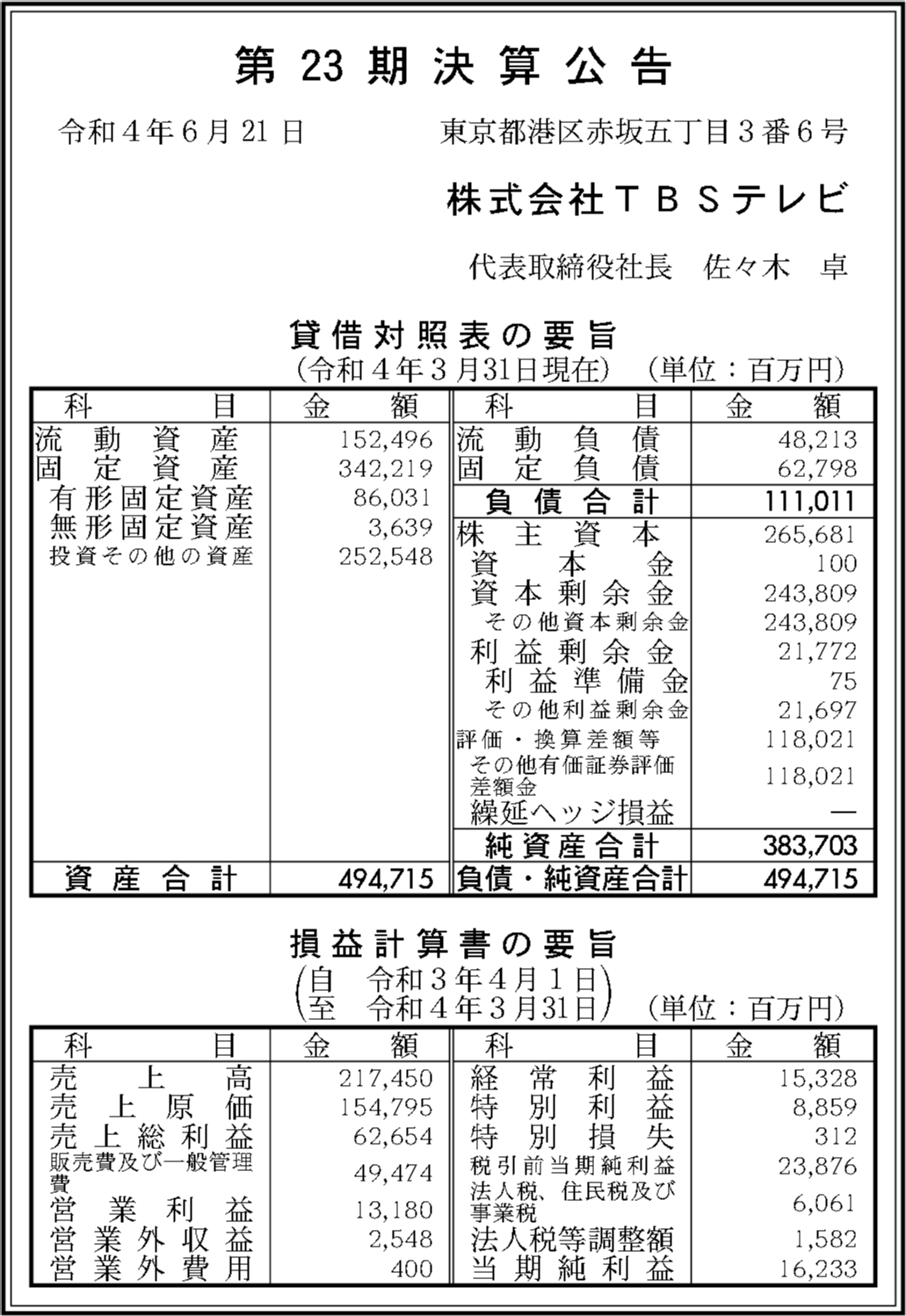 | 2022年03月31日 | 23期 | 2,174億5,000万円 | 162億3,300万円 | 217億7,200万円 | 4,947億1,500万円 |