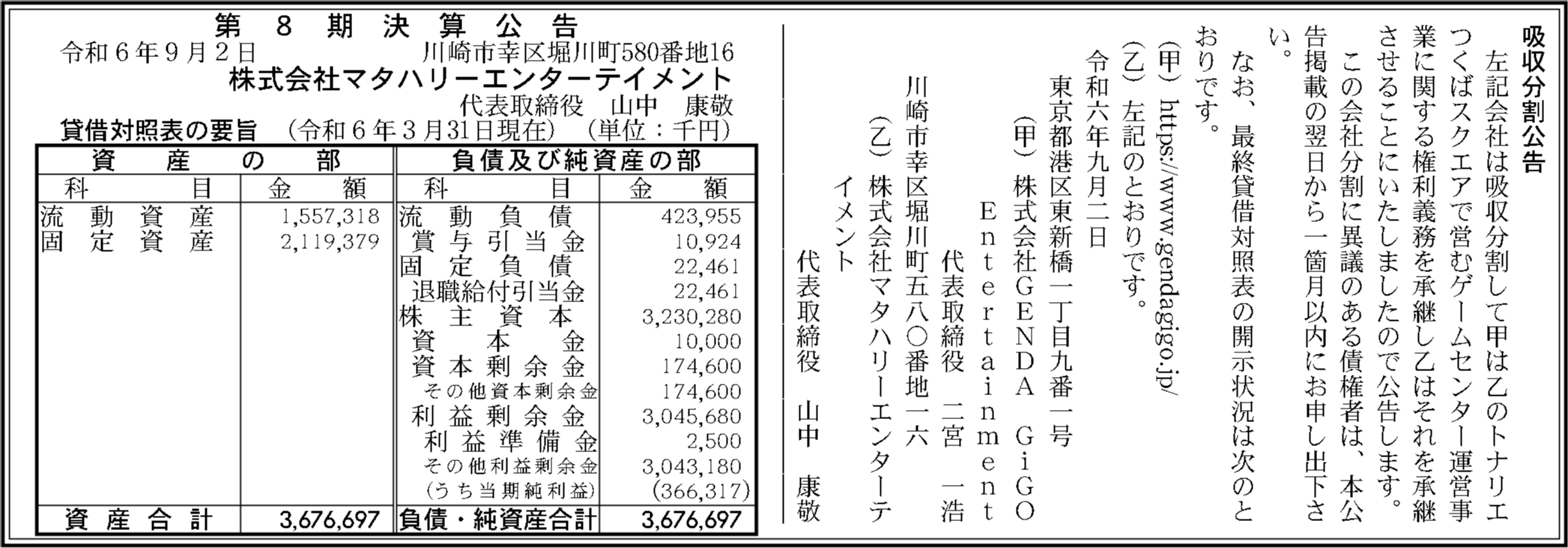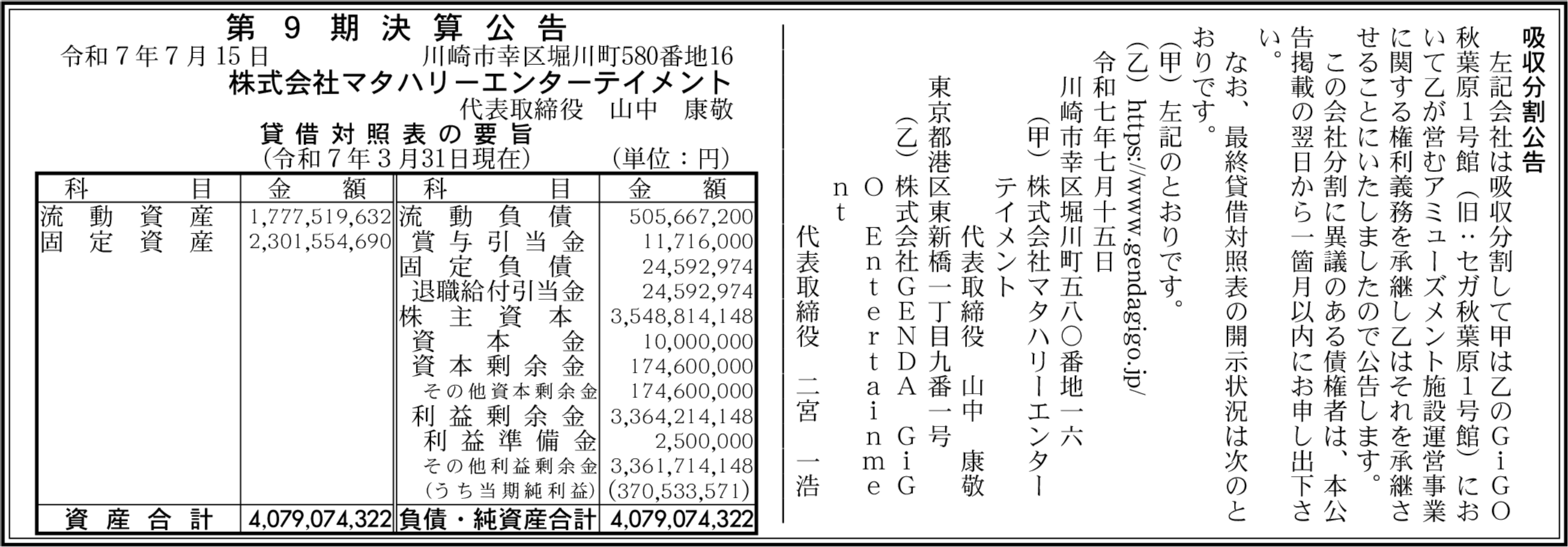 | 法人名 | 株式会社マタハリーエンターテイメント |