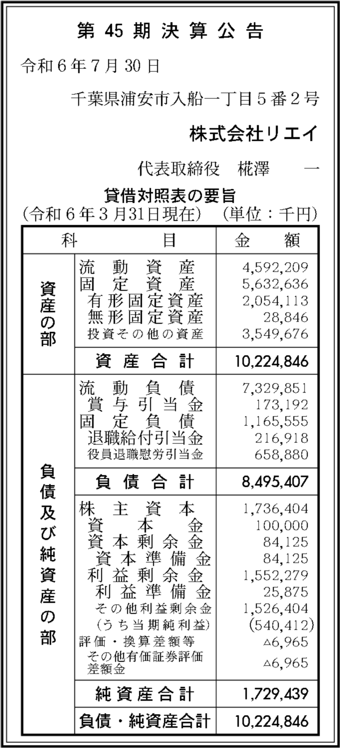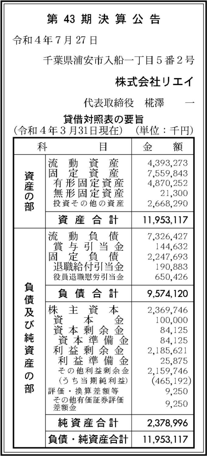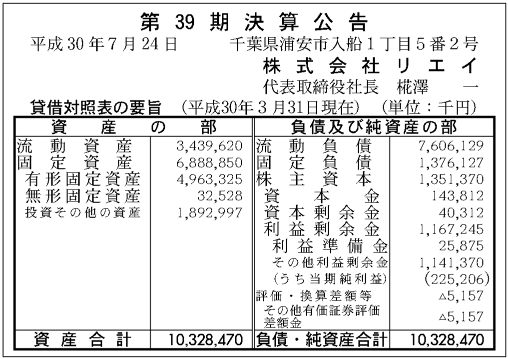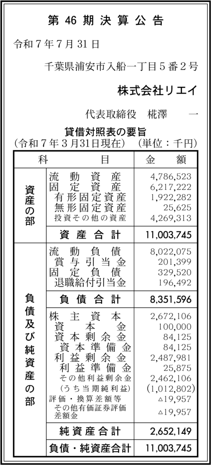 株式会社リエイの過去の決算一覧