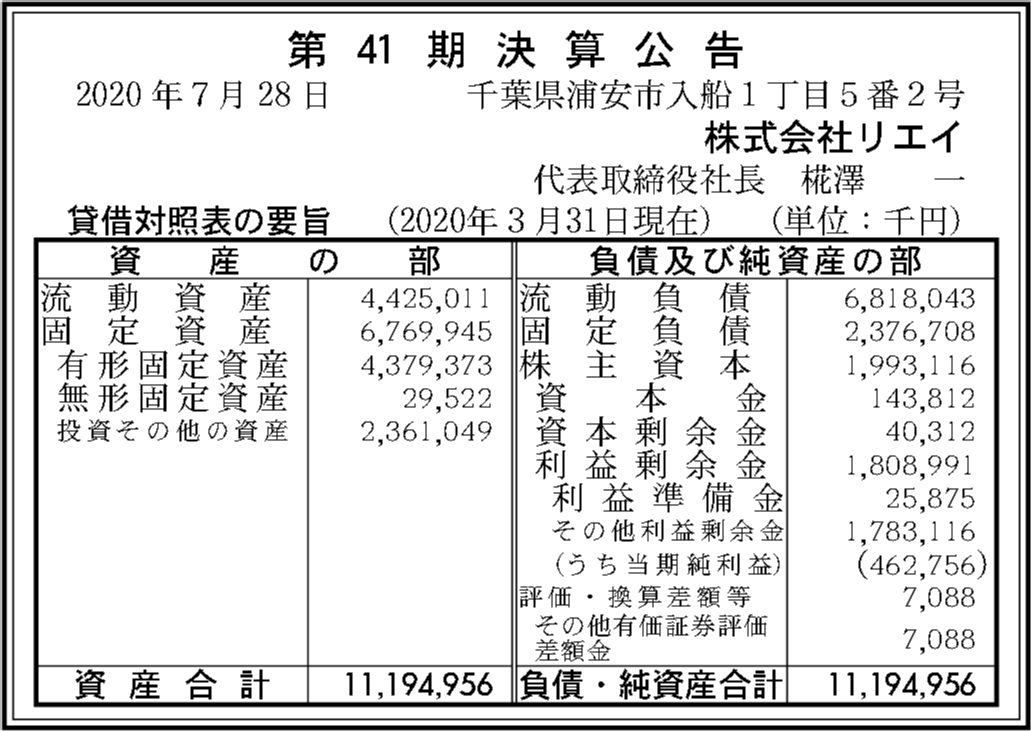 | 2020年12月31日 | 41期 | 4億6,275万6,000円 | 18億899万1,000円 | 111億9,495万6,000円 |