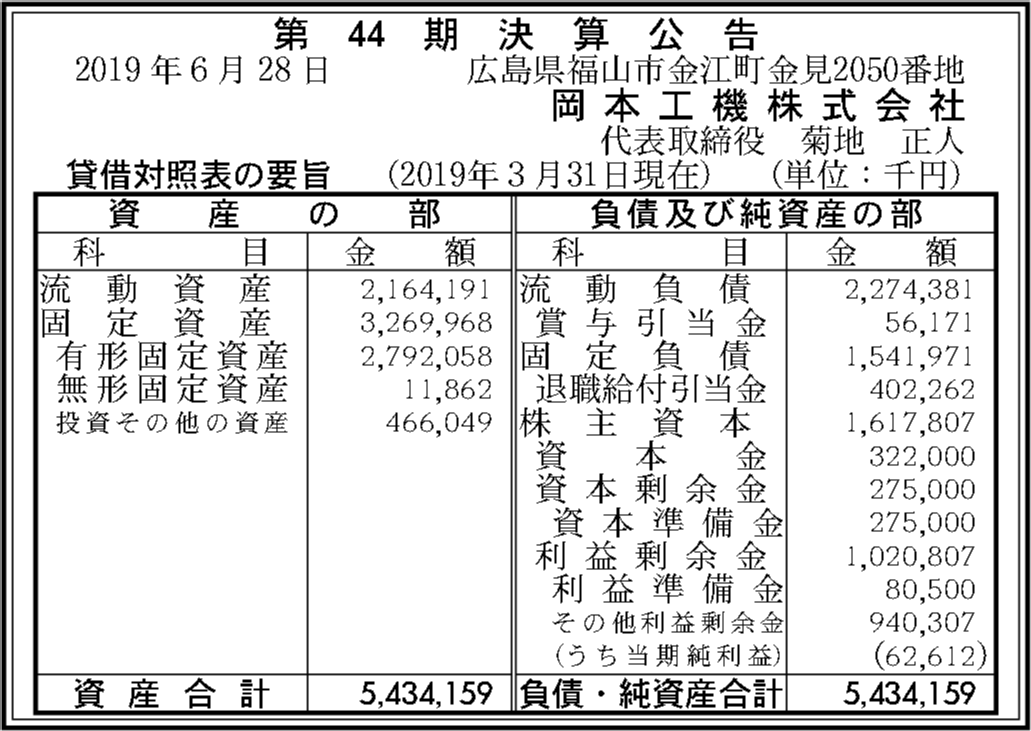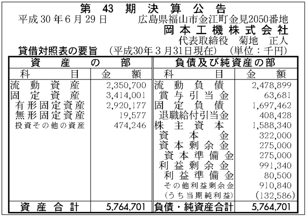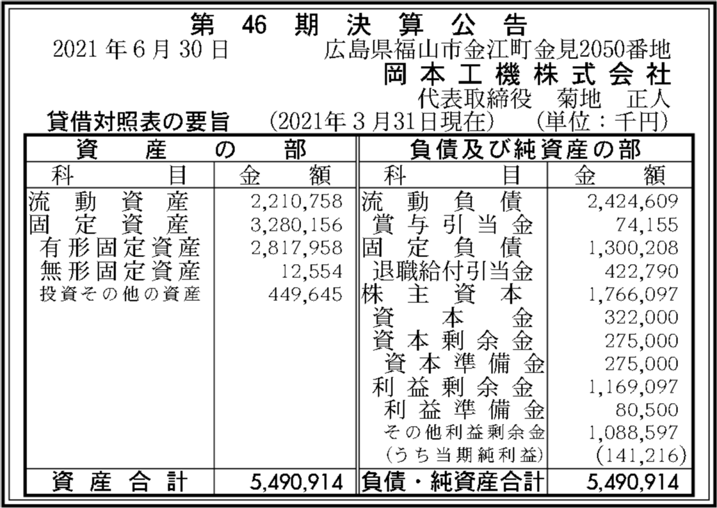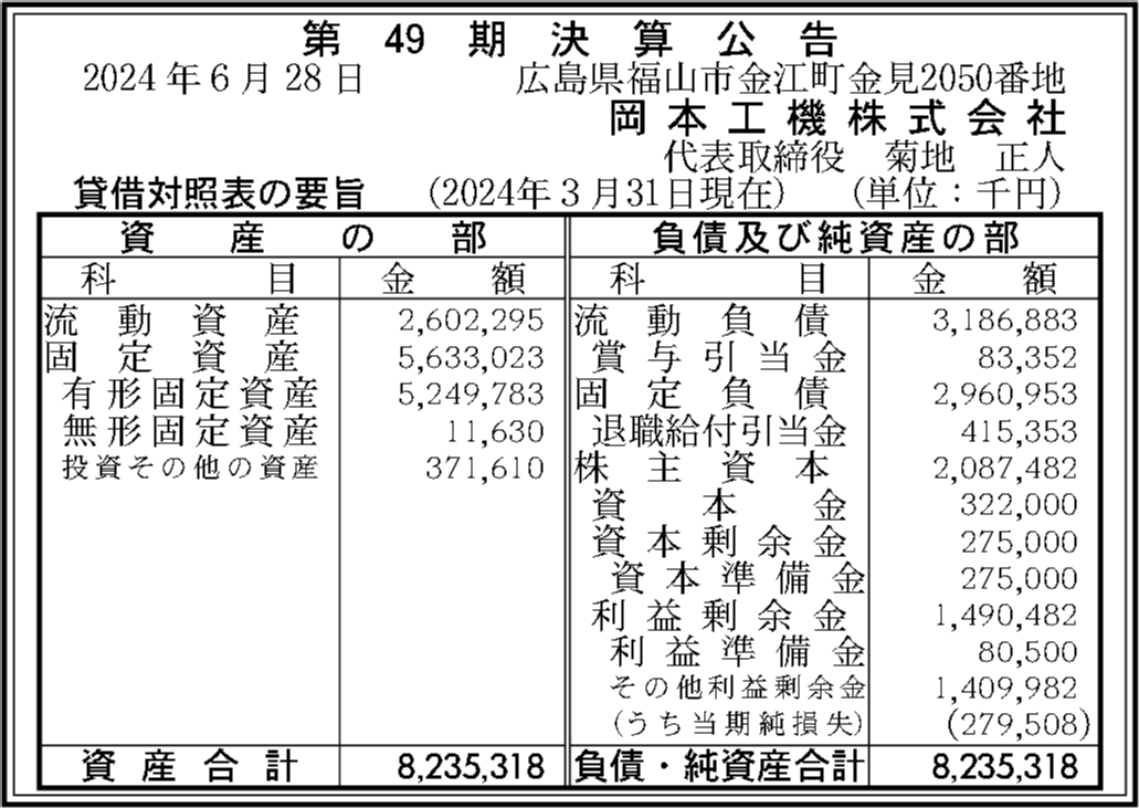 岡本工機株式会社の過去の決算一覧