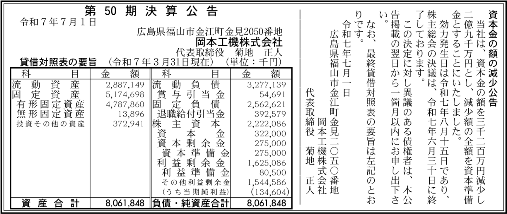 | 法人名 | 岡本工機株式会社 |