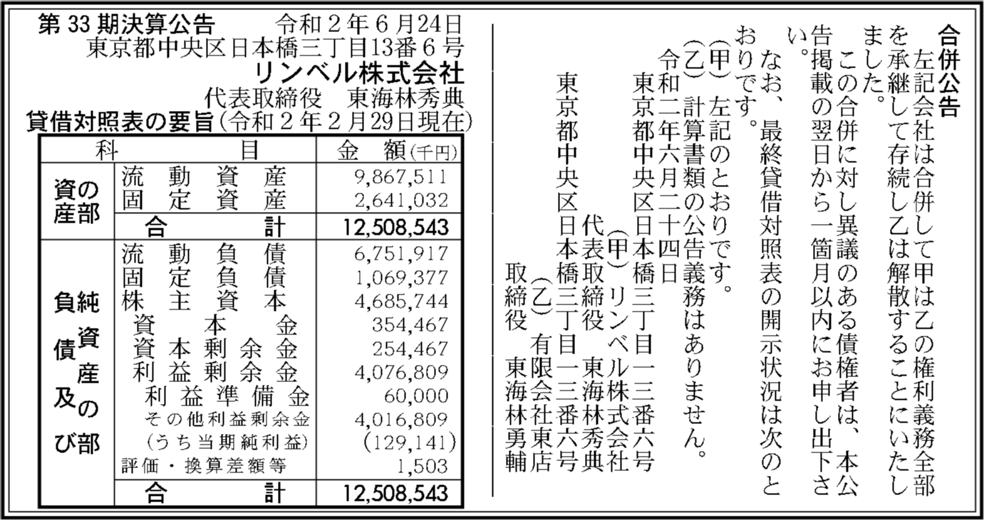 リンベル株式会社(リンベル)は、1987年7月設立の代表取締役 東海林秀典が社長/代表を務める東京都中央区日本橋3丁目13番6号に所在する法人です(法人番号: 4010001083675)。最終登記更新は2020/08/07で、吸収合併を実施しました。