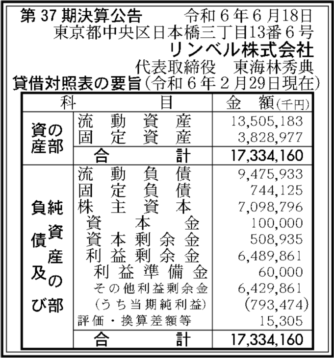 | 2024年02月29日 | 37期 | 7億9,347万4,000円 | 64億8,986万1,000円 | 173億3,416万円 |