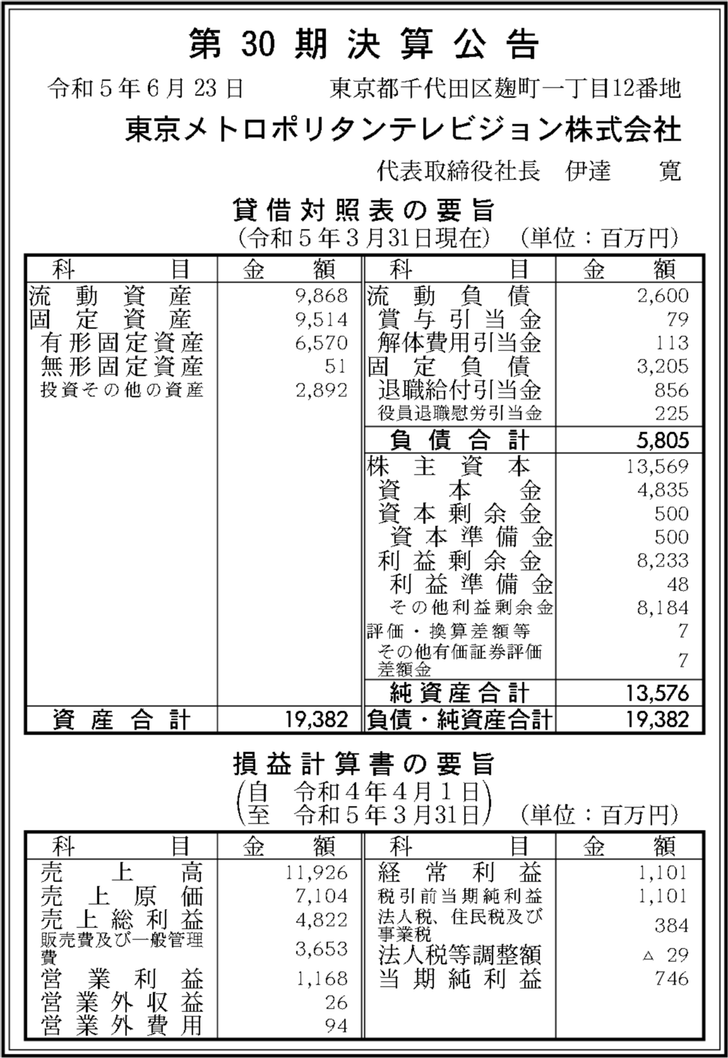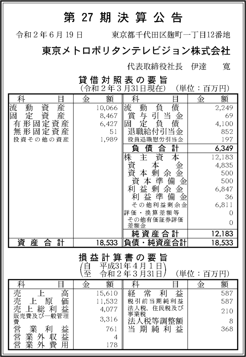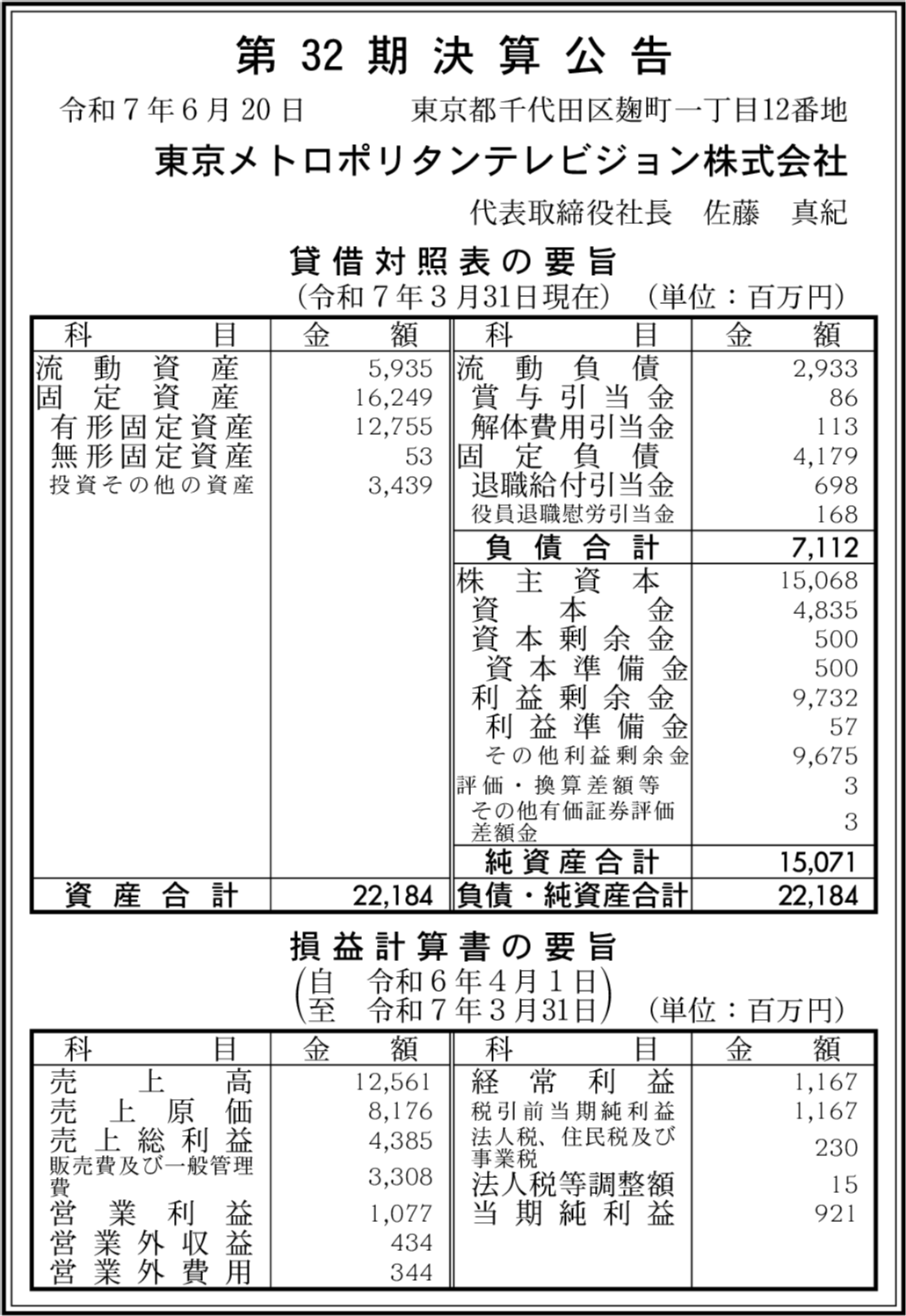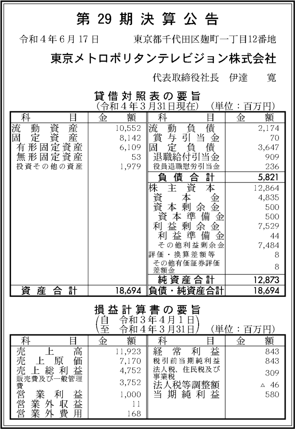 | 法人名 | 東京メトロポリタンテレビジョン株式会社 |