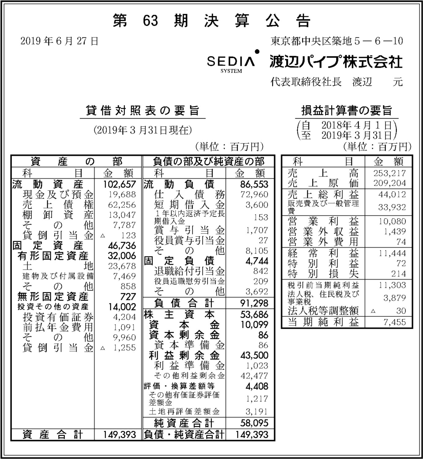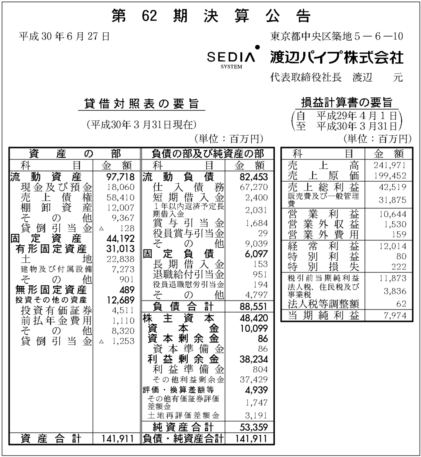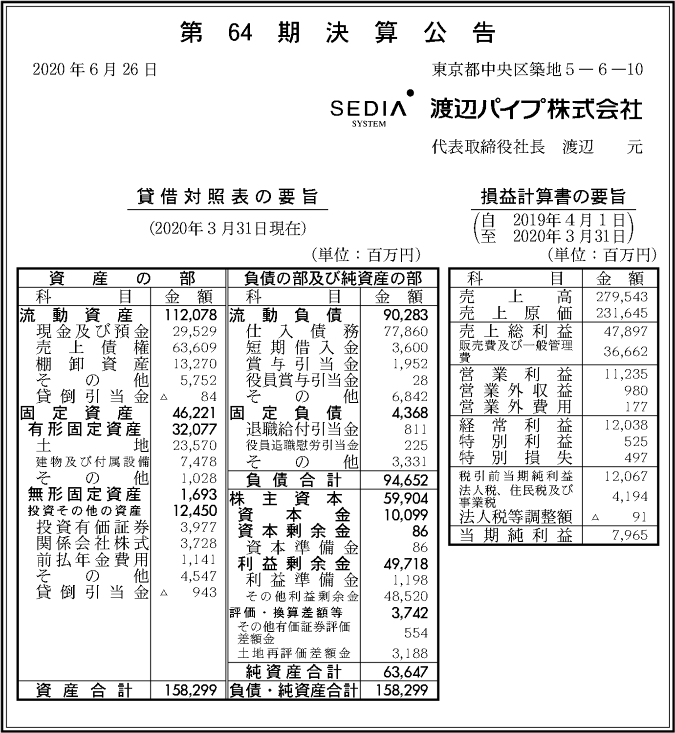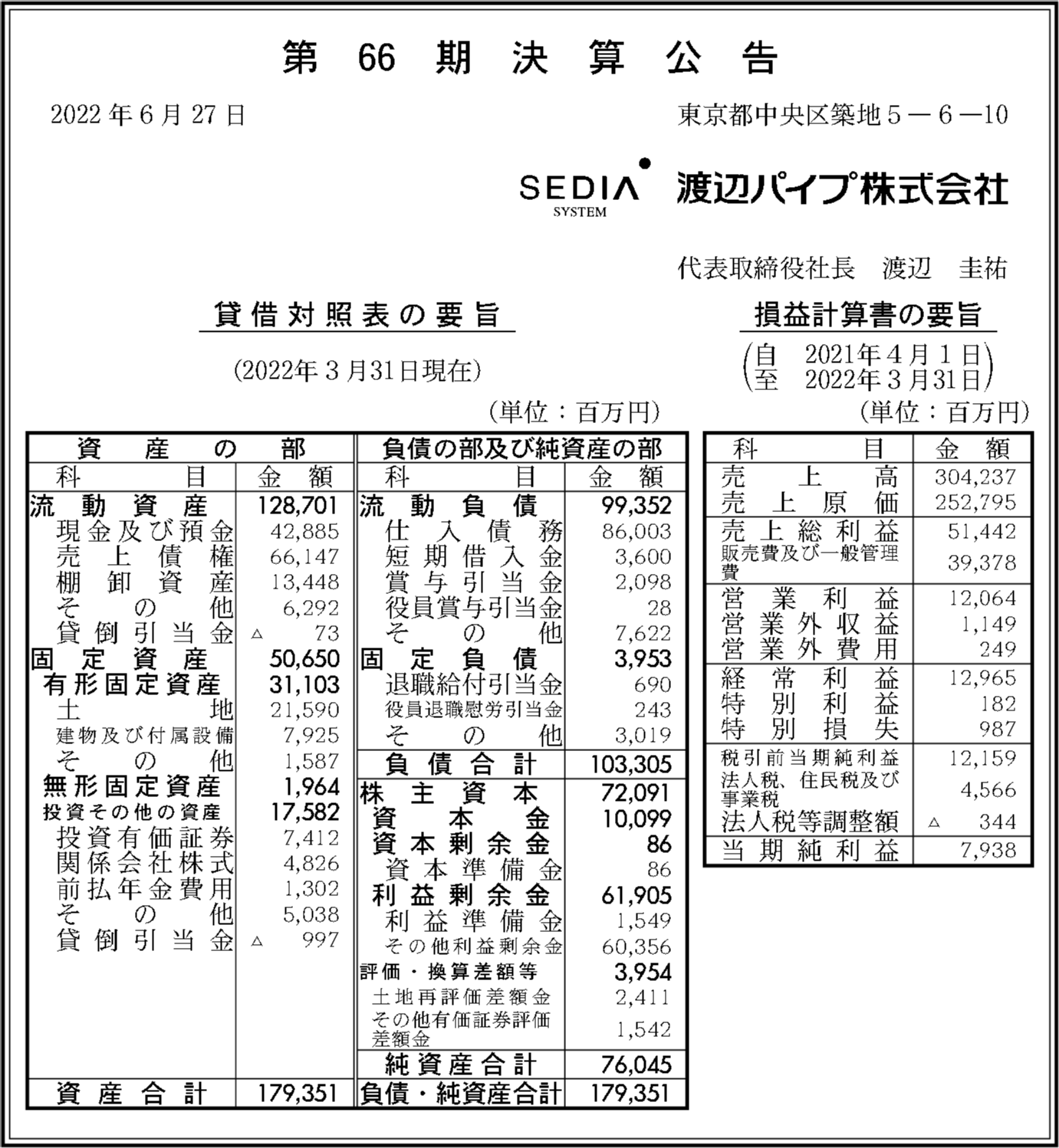 渡辺パイプ株式会社の過去の決算一覧