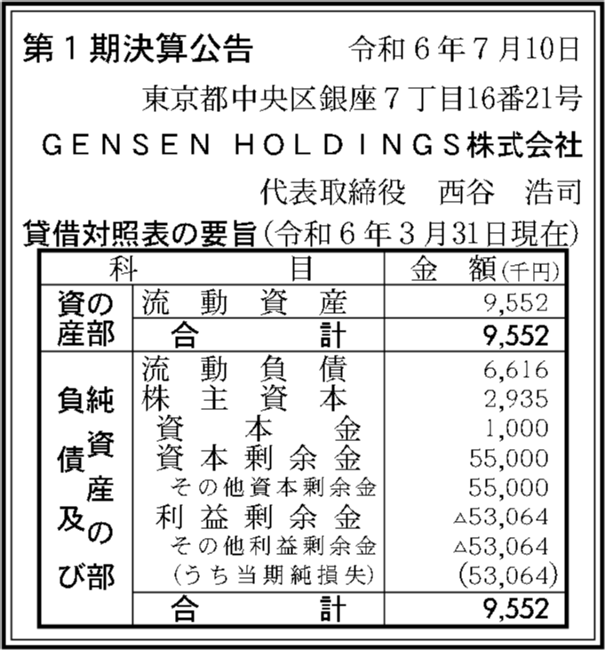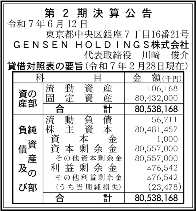 | 法人名 | GENSEN HOLDINGS株式会社 |