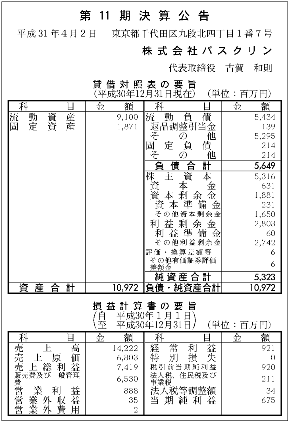 | 2018年12月31日 | 11期 | 142億2,200万円 | 6億7,500万円 | 28億300万円 | 109億7,200万円 |
