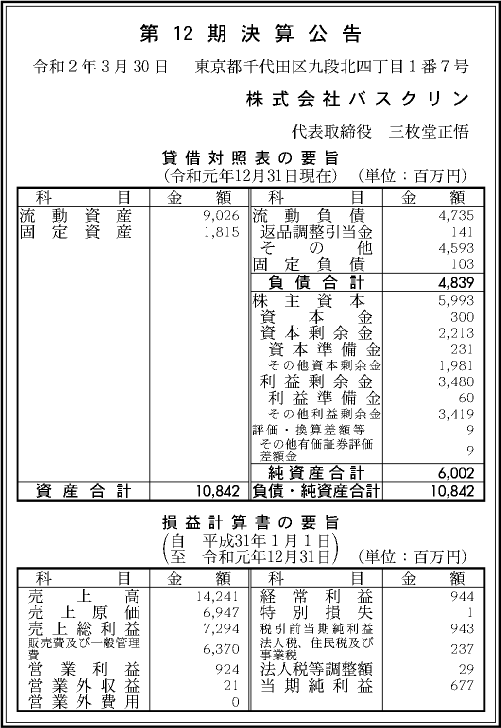 株式会社バスクリン(バスクリン)は、2008年07月設立の三枚堂正悟が社長/代表を務める東京都千代田区九段北4丁目1番7号に所在する法人です(法人番号: 4010401079934)。最終登記更新は2015/10/05で、新規設立(法人番号登録)を実施しました。