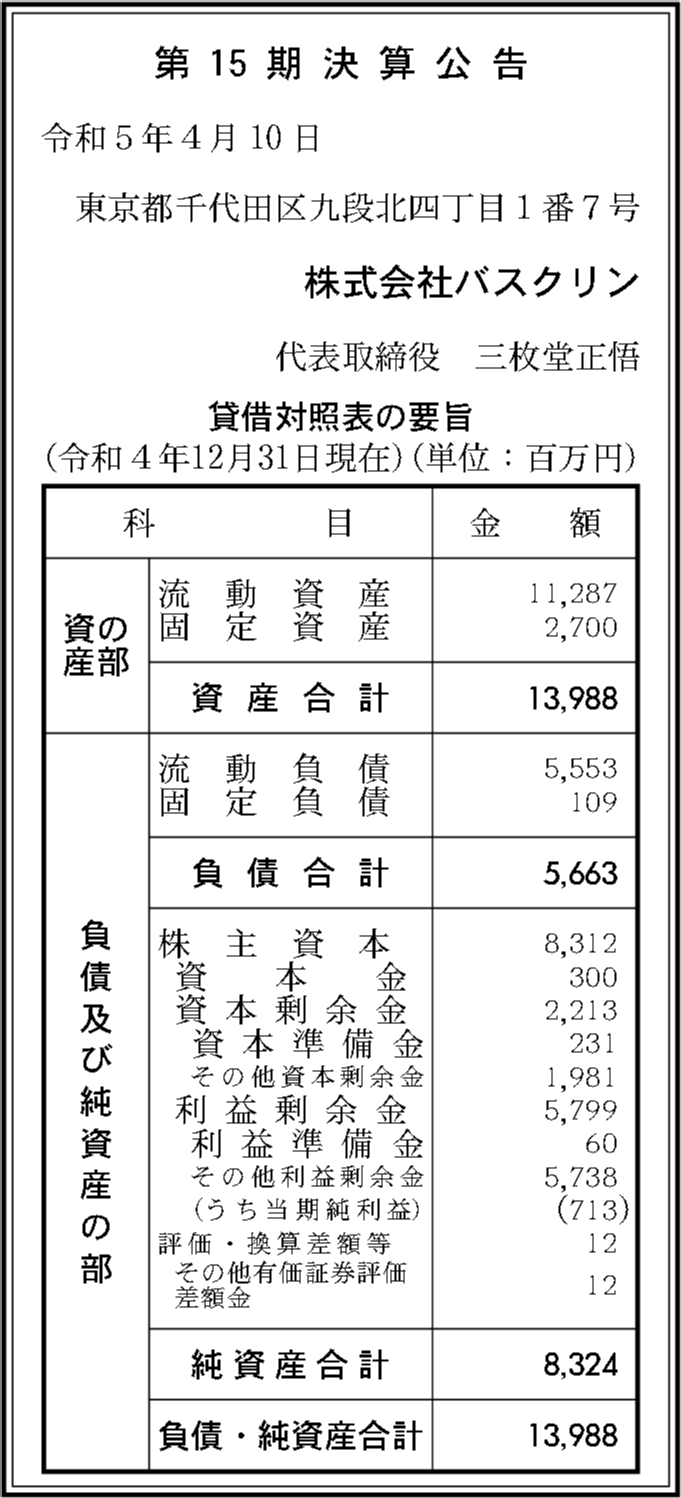 | 2022年12月31日 | 15期 | – | 7億1,300万円 | 57億9,900万円 | 139億8,800万円 |