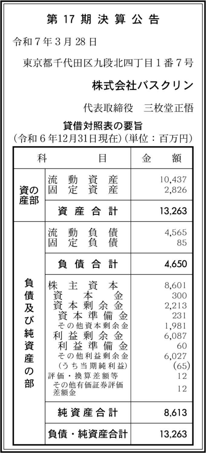 | 2024年12月31日 | 17期 | – | 6,500万円 | 60億8,700万円 | 132億6,300万円 |