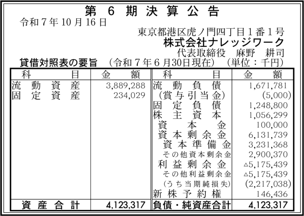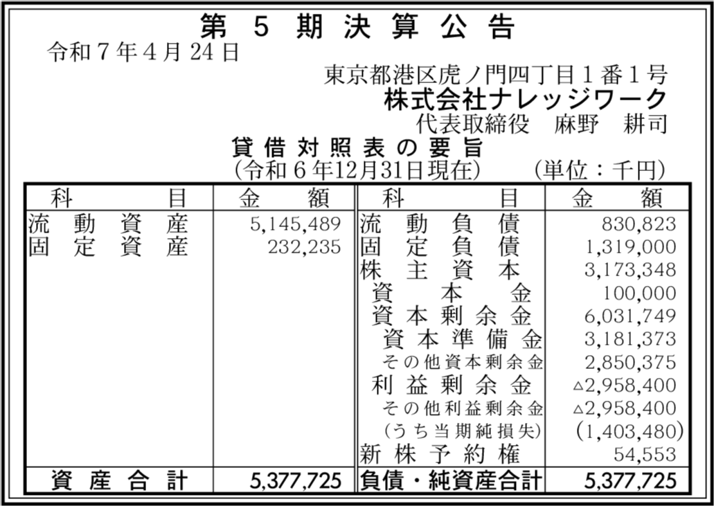 株式会社ナレッジワーク(ナレッジワーク)は、2020年設立の麻野耕司が社長/代表を務める東京都港区虎ノ門4丁目1番1号に所在する法人です(法人番号: 4010401151825)。最終登記更新は2025/07/01で、吸収合併を実施しました。