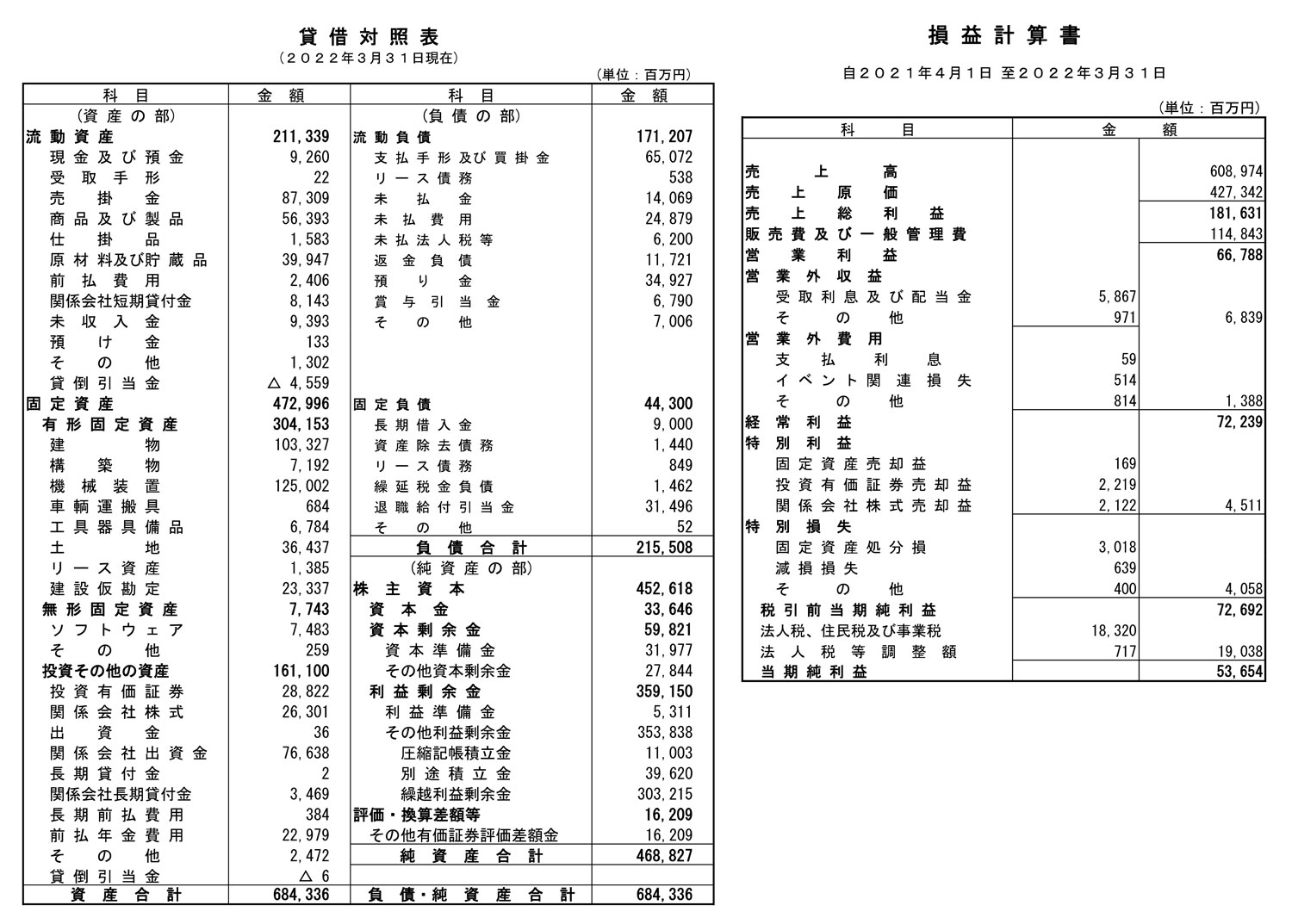 | 2022年03月31日 | 144期 | 6089億7400万円 | 536億5400万円 | 3591億5000万円 | 6843億3600万円 |