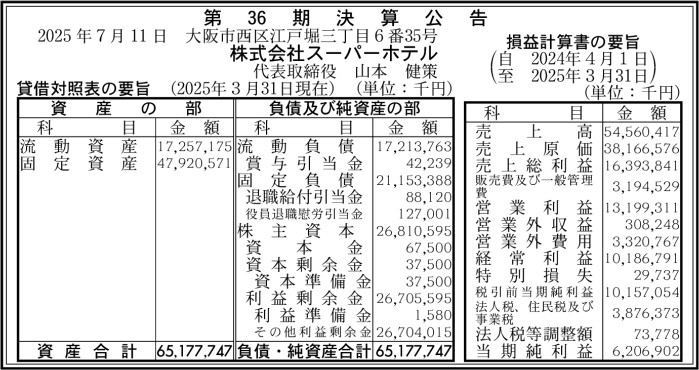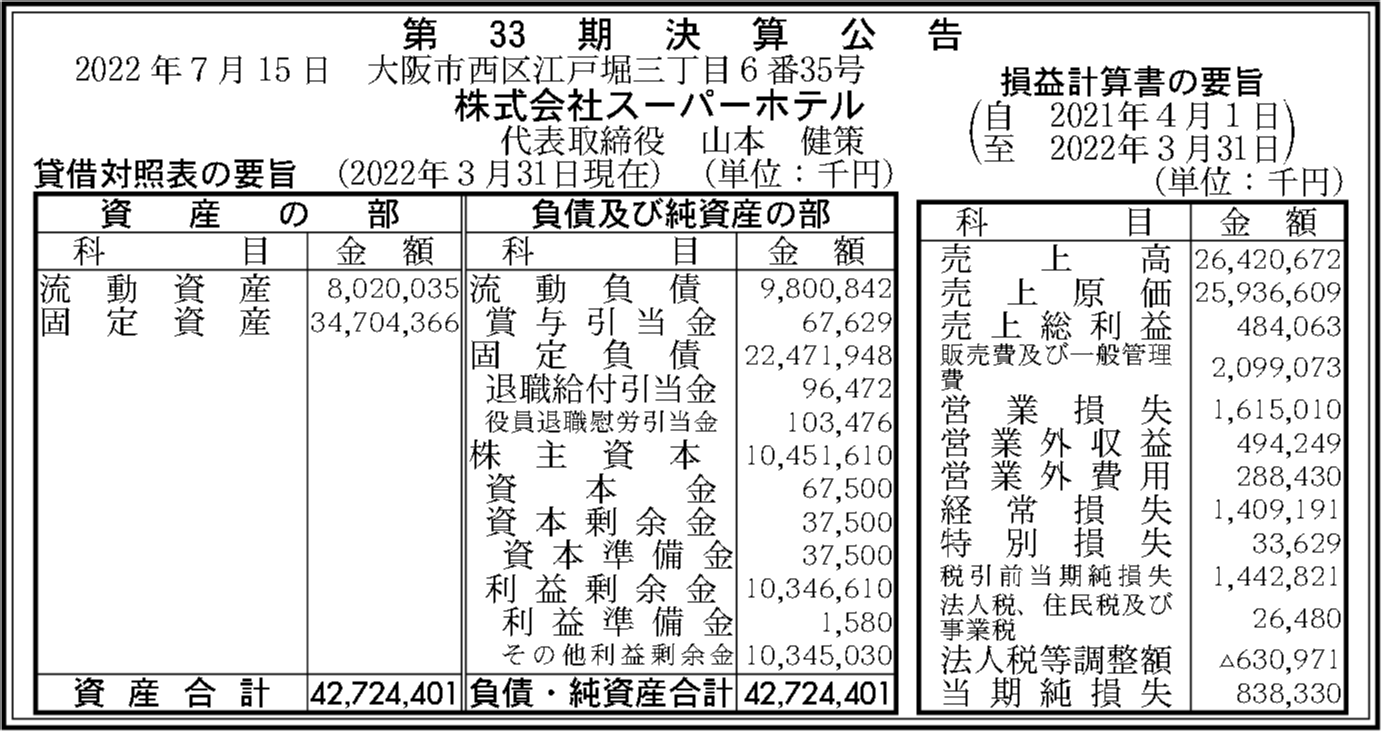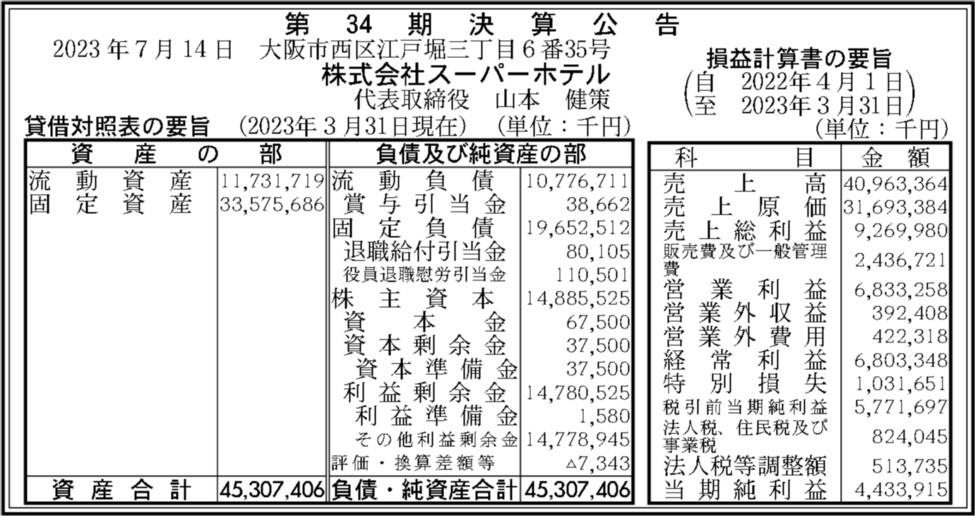 | 法人名 | 株式会社スーパーホテル |