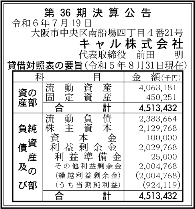 キャル株式会社の過去の決算一覧
