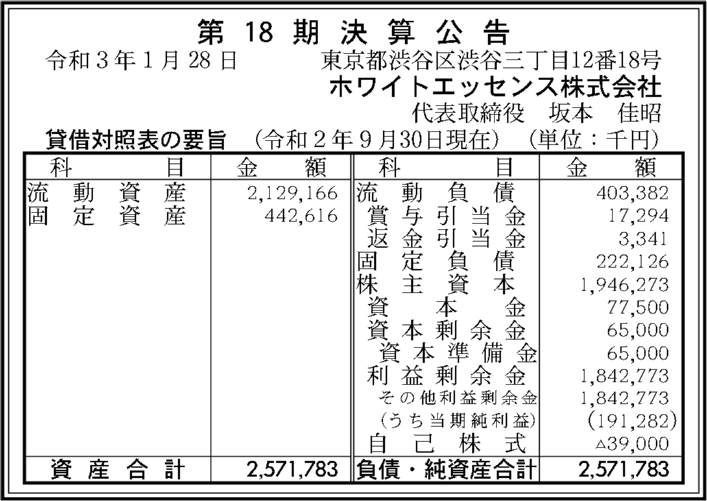 | 2020年09月30日 | 18期 | 1億9,128万2,000円 | 18億4,277万3,000円 | 25億7,178万3,000円 |