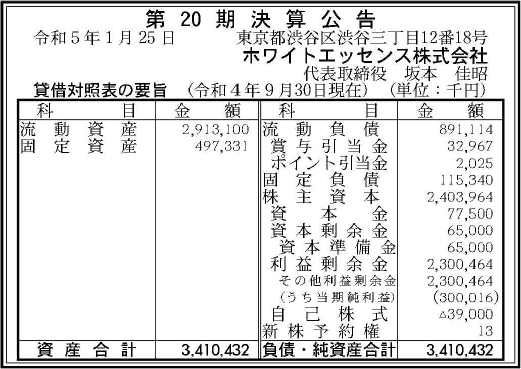 | 2022年09月30日 | 20期 | 3億1万6,000円 | 23億46万4,000円 | 34億1,043万2,000円 |