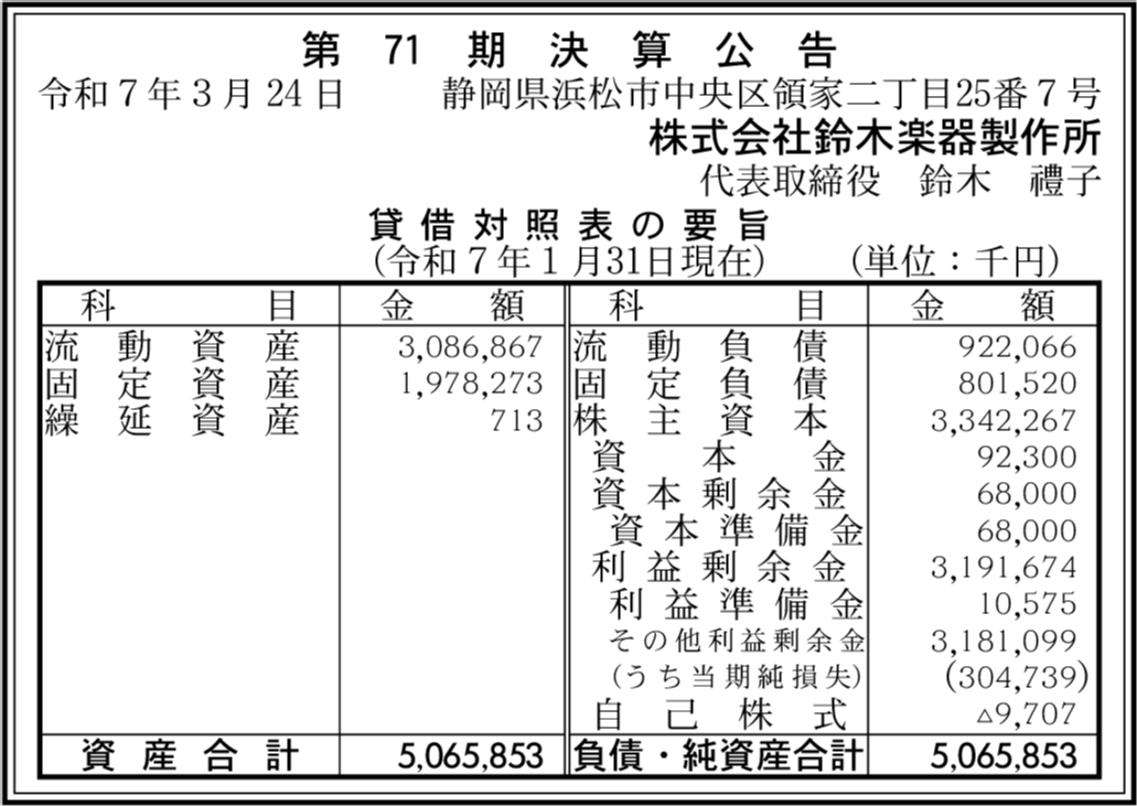 | 2025年01月31日 | 71期 | ▲3億473万9,000円 | 31億9,167万4,000円 | 50億6,585万3,000円 |