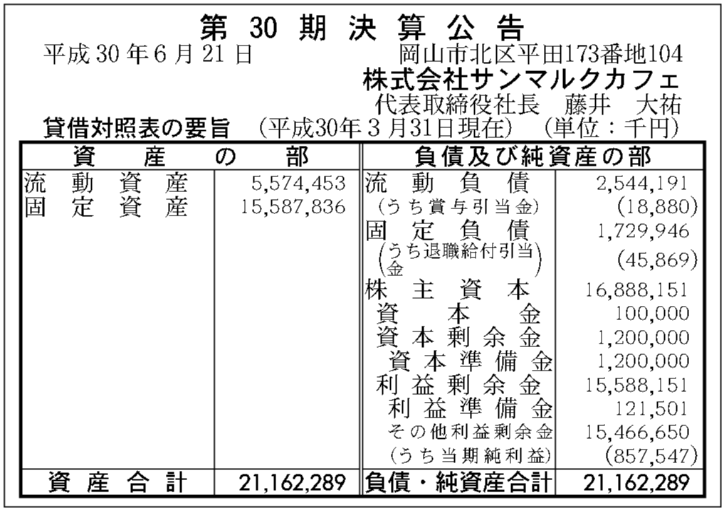 | 2018年03月31日 | 30期 | 8億5,754万7,000円 | 155億8,815万1,000円 | 211億6,228万9,000円 |