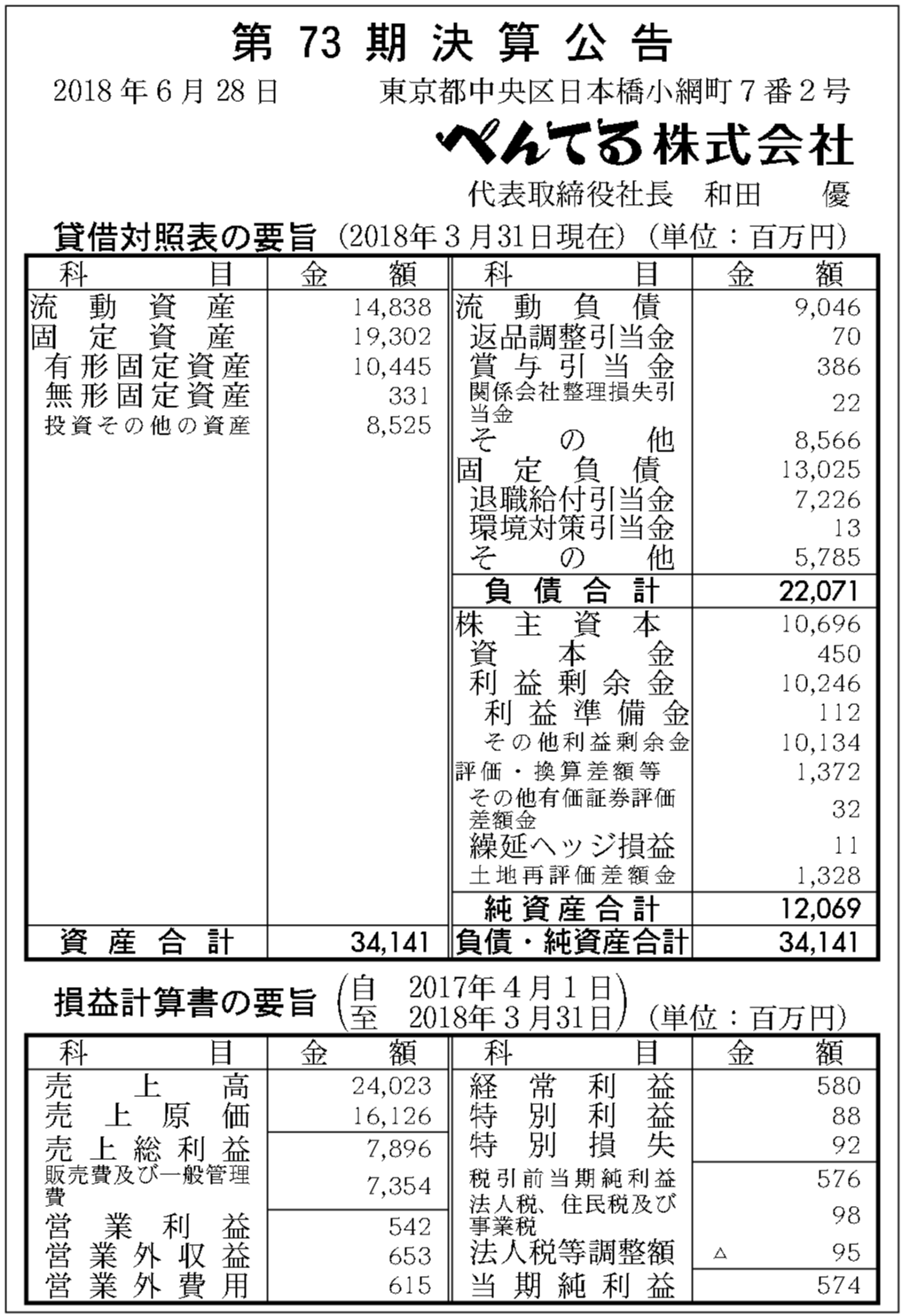 | 2018年03月31日 | 73期 | 240億2,300万円 | 5億7,400万円 | 102億4,600万円 | 341億4,100万円 |