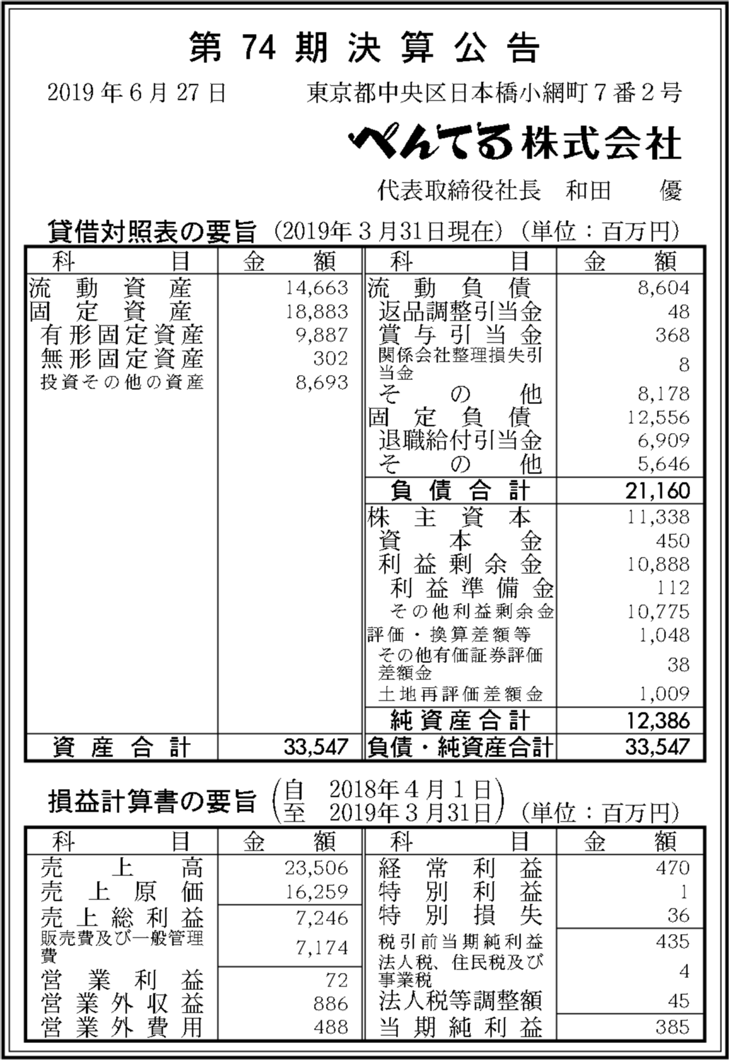 | 2019年03月31日 | 74期 | 235億600万円 | 3億8,500万円 | 108億8,800万円 | 335億4,700万円 |