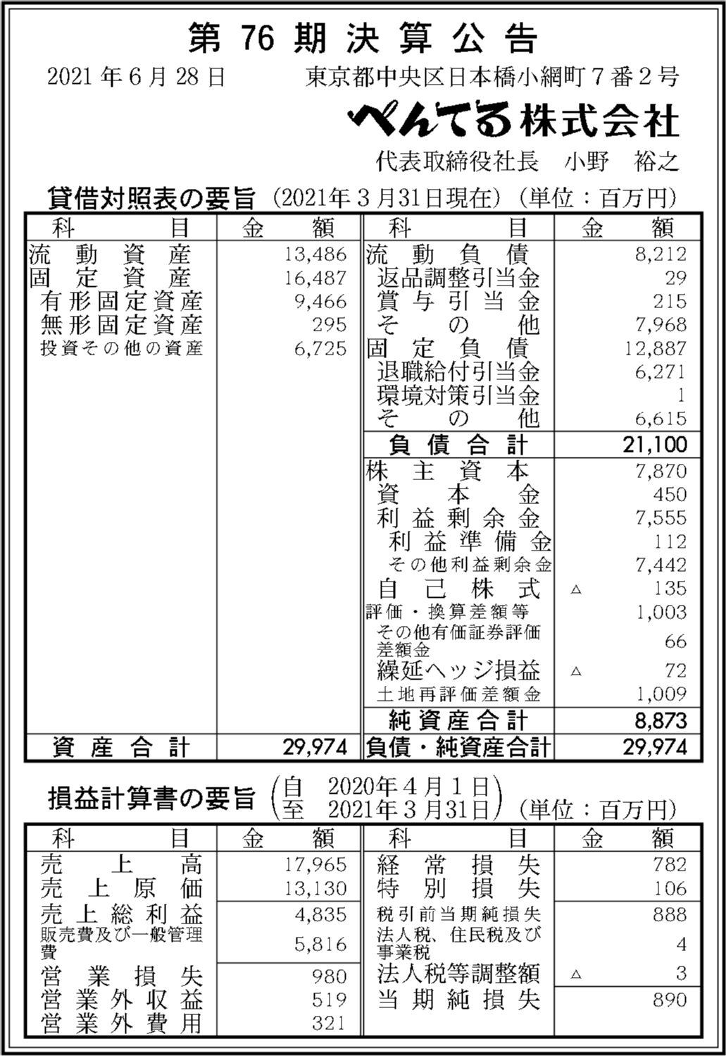 | 2021年03月31日 | 76期 | 179億6,500万円 | ▲8億9,000万円 | 75億5,500万円 | 299億7,400万円 |