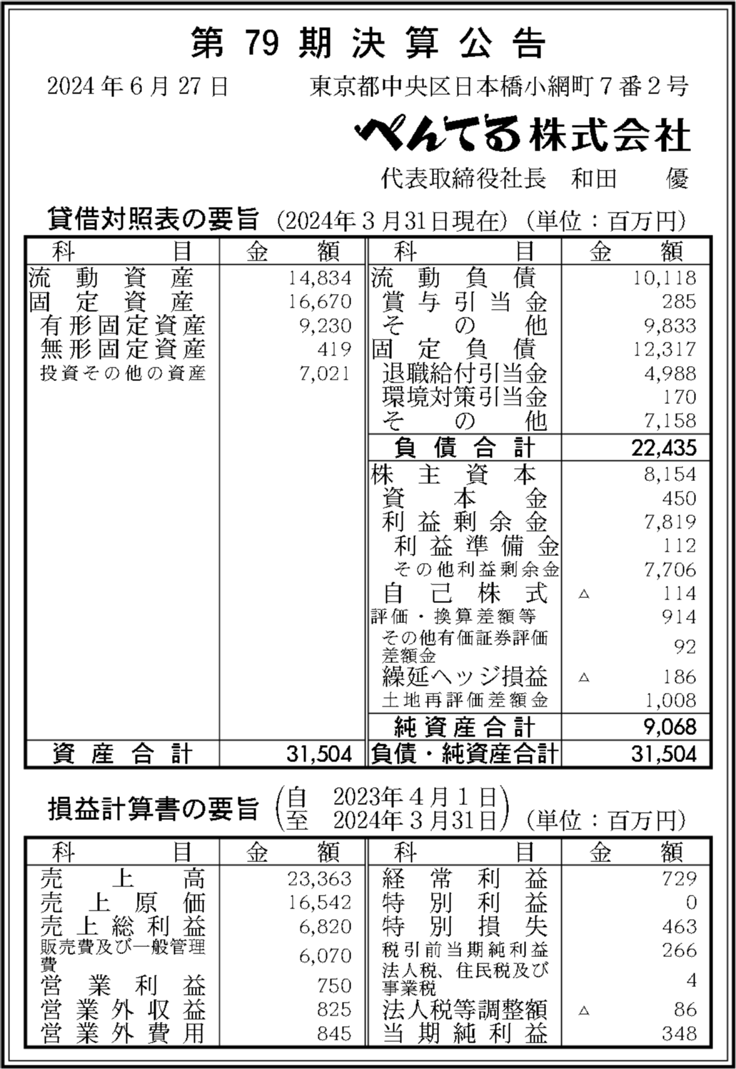 | 2024年03月31日 | 79期 | 233億6,300万円 | 3億4,800万円 | 78億1,900万円 | 315億400万円 |