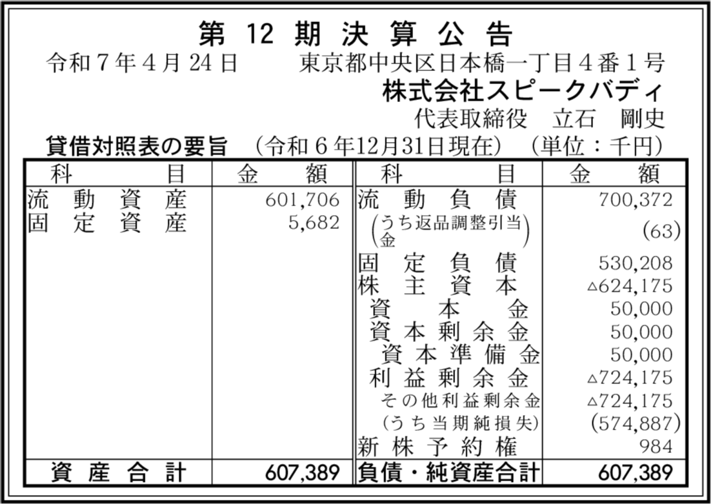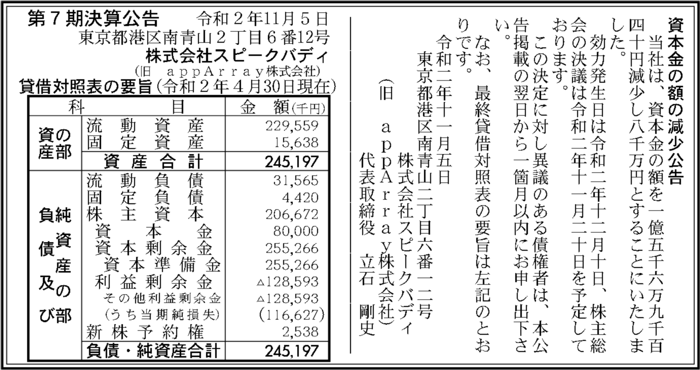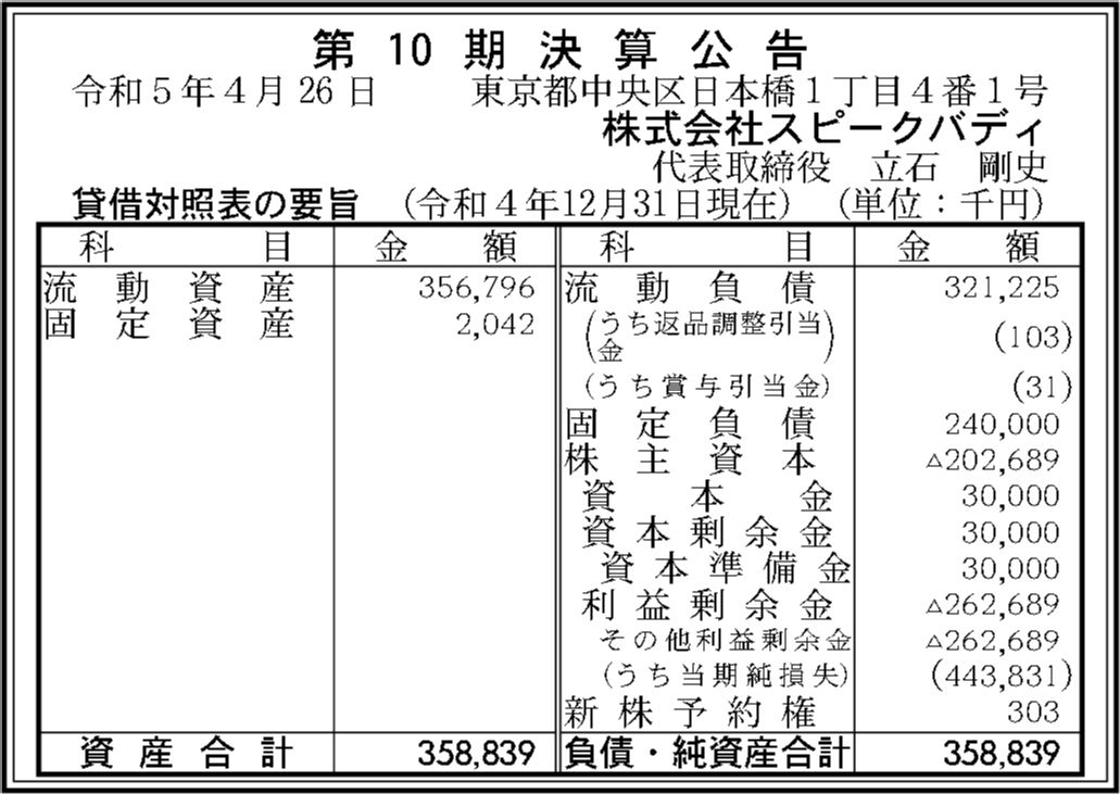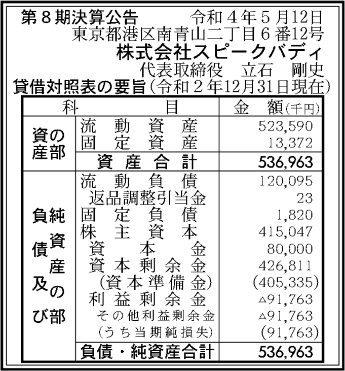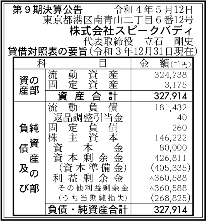 株式会社スピークバディの過去の決算一覧