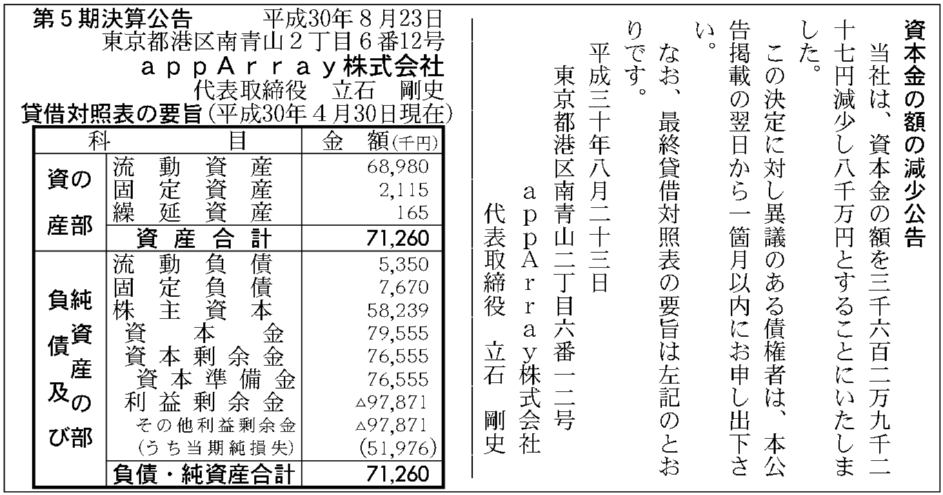 | 2018年04月30日 | 5期 | ▲5,197万6,000円 | ▲9,787万1,000円 | 7,126万円 |