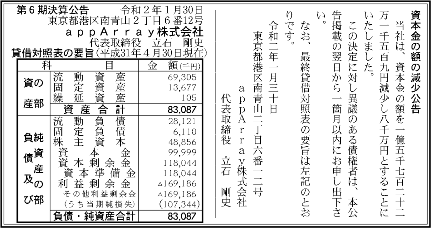 | 2019年04月30日 | 6期 | ▲1億734万4,000円 | ▲1億6,918万6,000円 | 8,308万7,000円 |