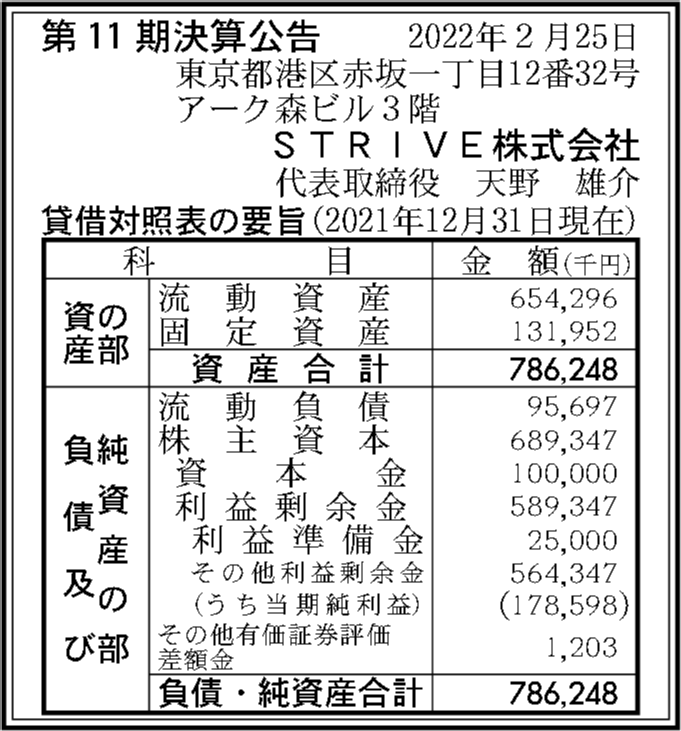 | 2021年12月31日 | 11期 | 1億7,859万8,000円 | 5億8,934万7,000円 | 7億8,624万8,000円 |