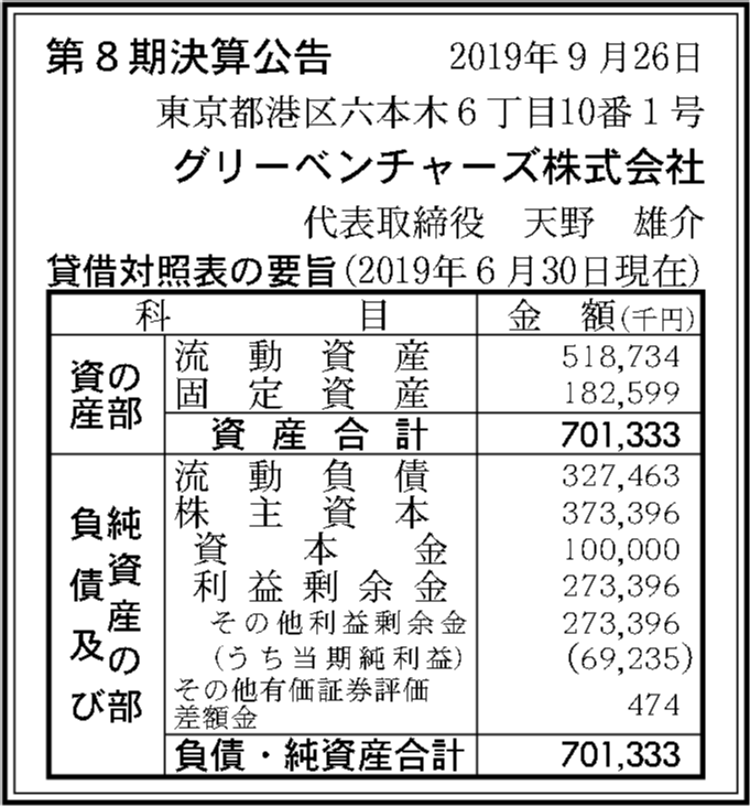 | 2019年06月30日 | 8期 | 6,923万5,000円 | 2億7,339万6,000円 | 7億133万3,000円 |
