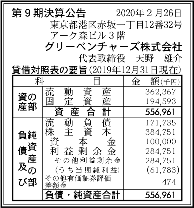 | 2019年12月31日 | 9期 | 6,178万3,000円 | 2億8,475万1,000円 | 5億5,696万1,000円 |