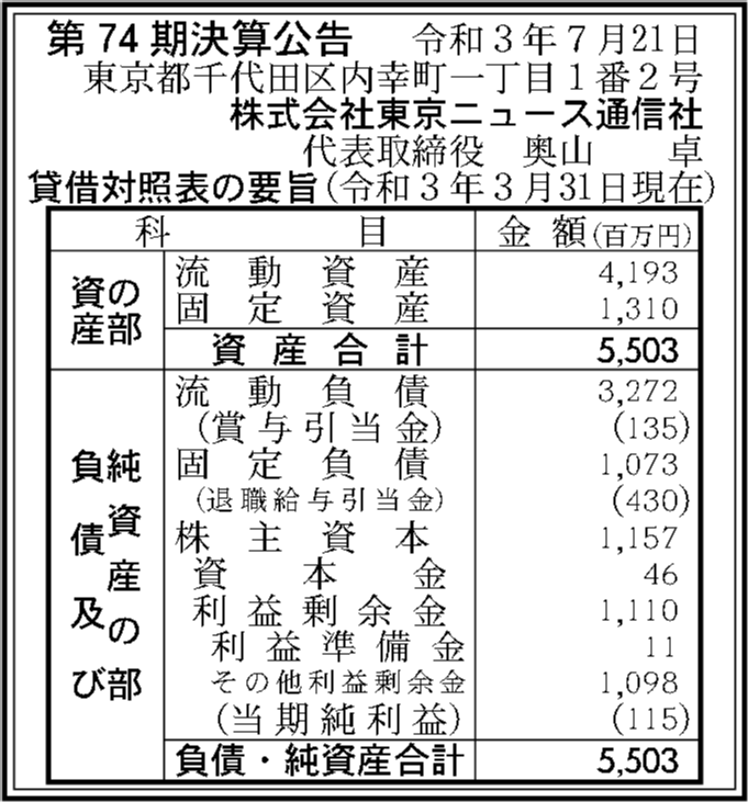 | 法人名 | 株式会社東京ニユース通信社 |