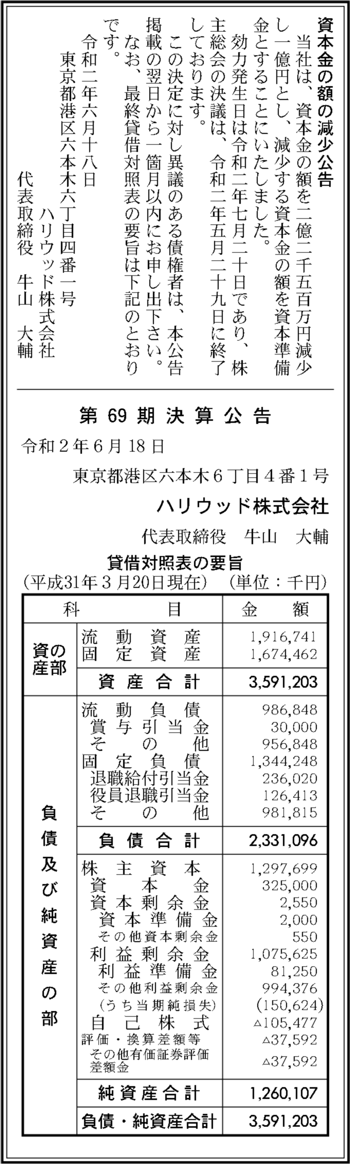 ハリウッド株式会社の登記簿謄本