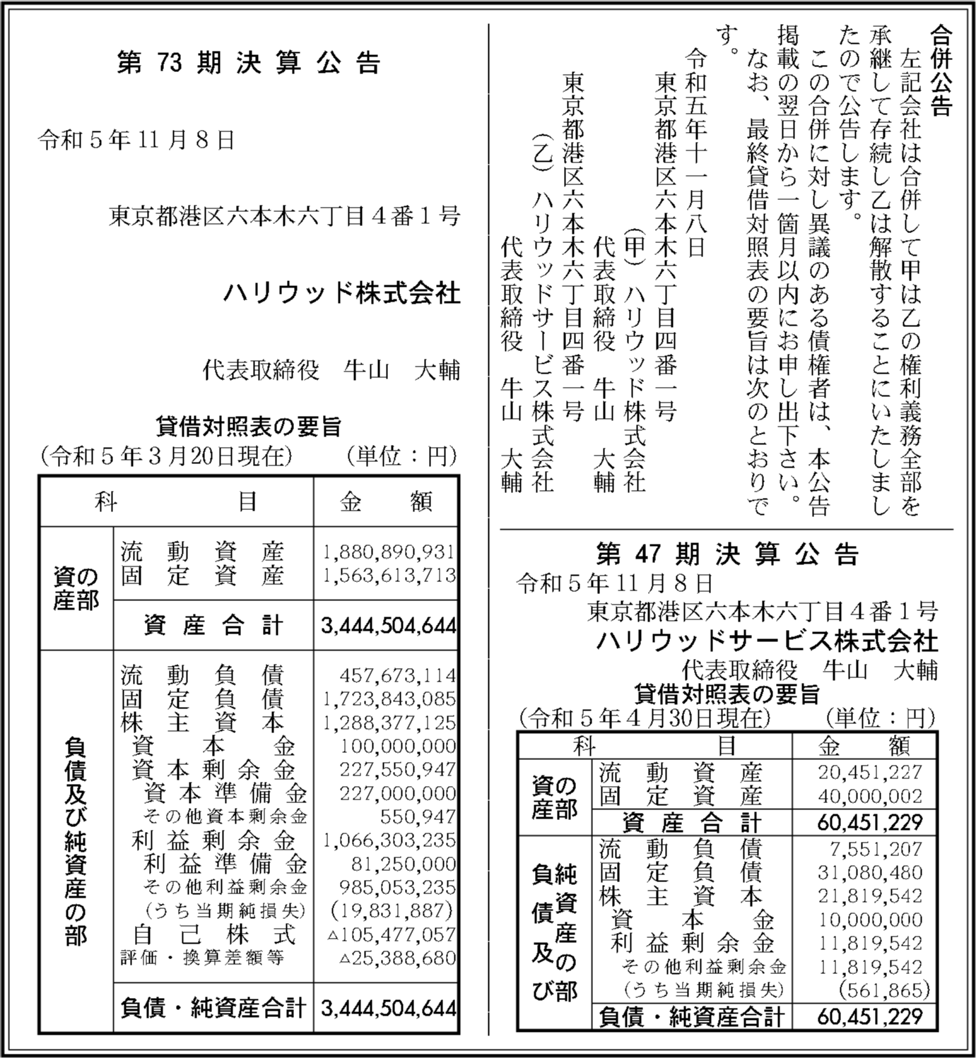 ハリウッド株式会社(ハリウッド)は、1925年10月設立の牛山大輔が社長/代表を務める東京都港区六本木6丁目4番1号に所在する法人です(法人番号: 7010401024458)。最終登記更新は2023/12/20で、吸収合併を実施しました。