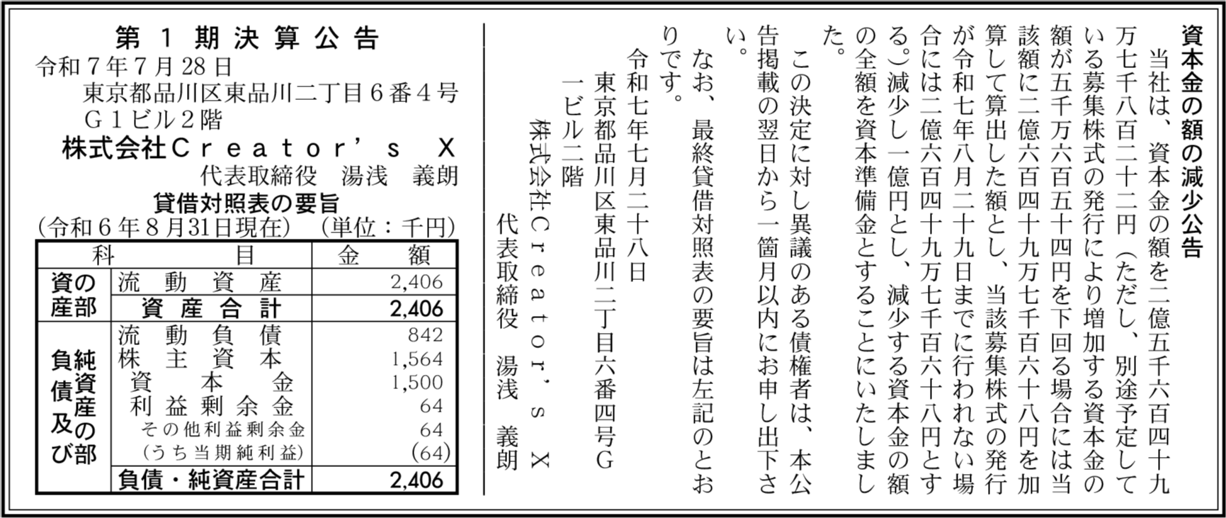 2024年8月期の決算(当期純利益: 6万4,000円)を掲載しています。