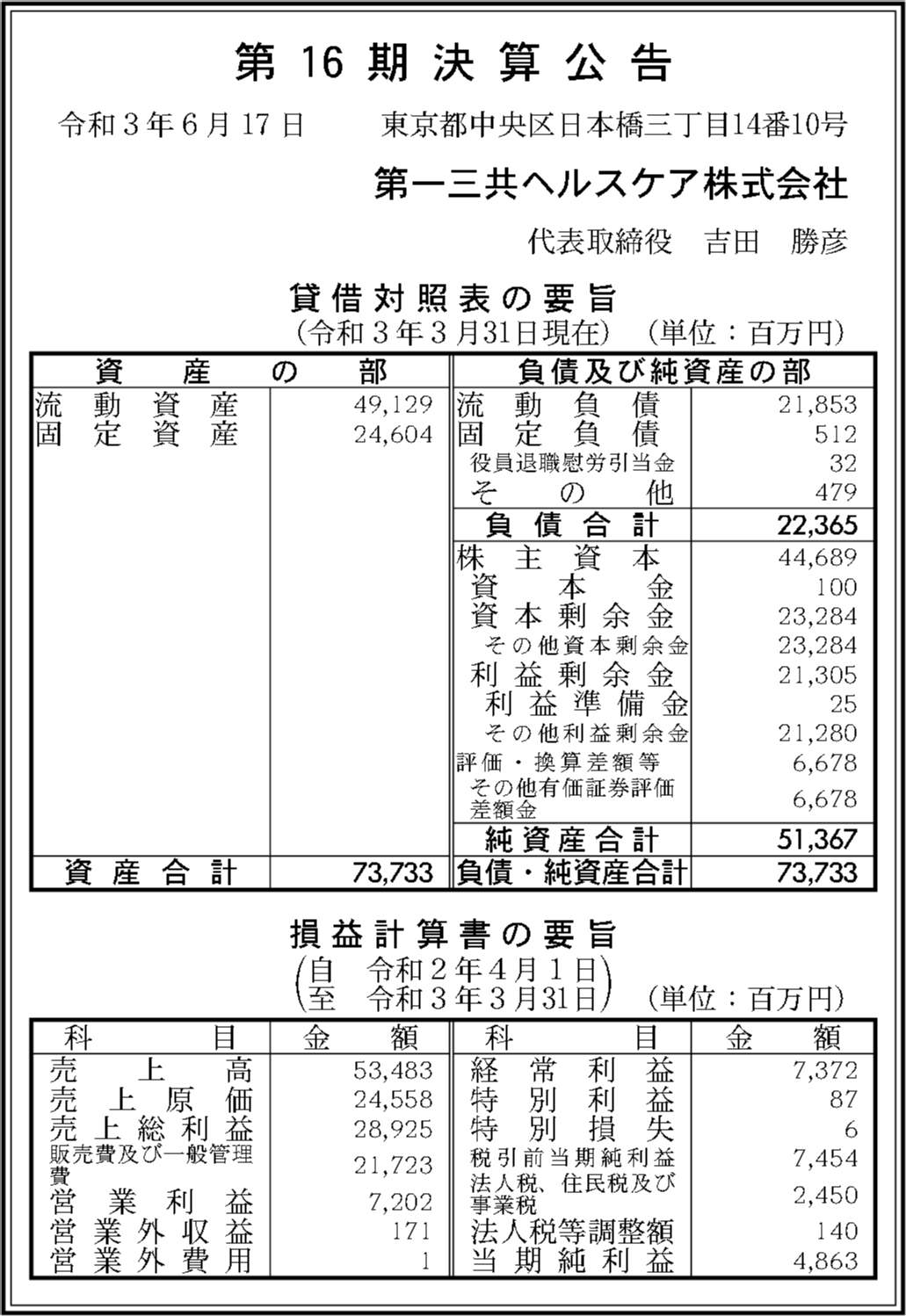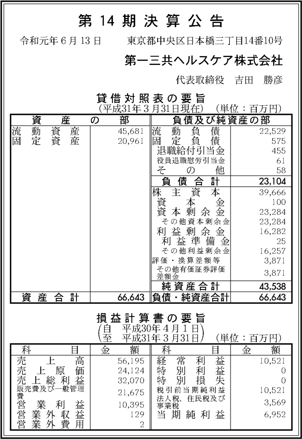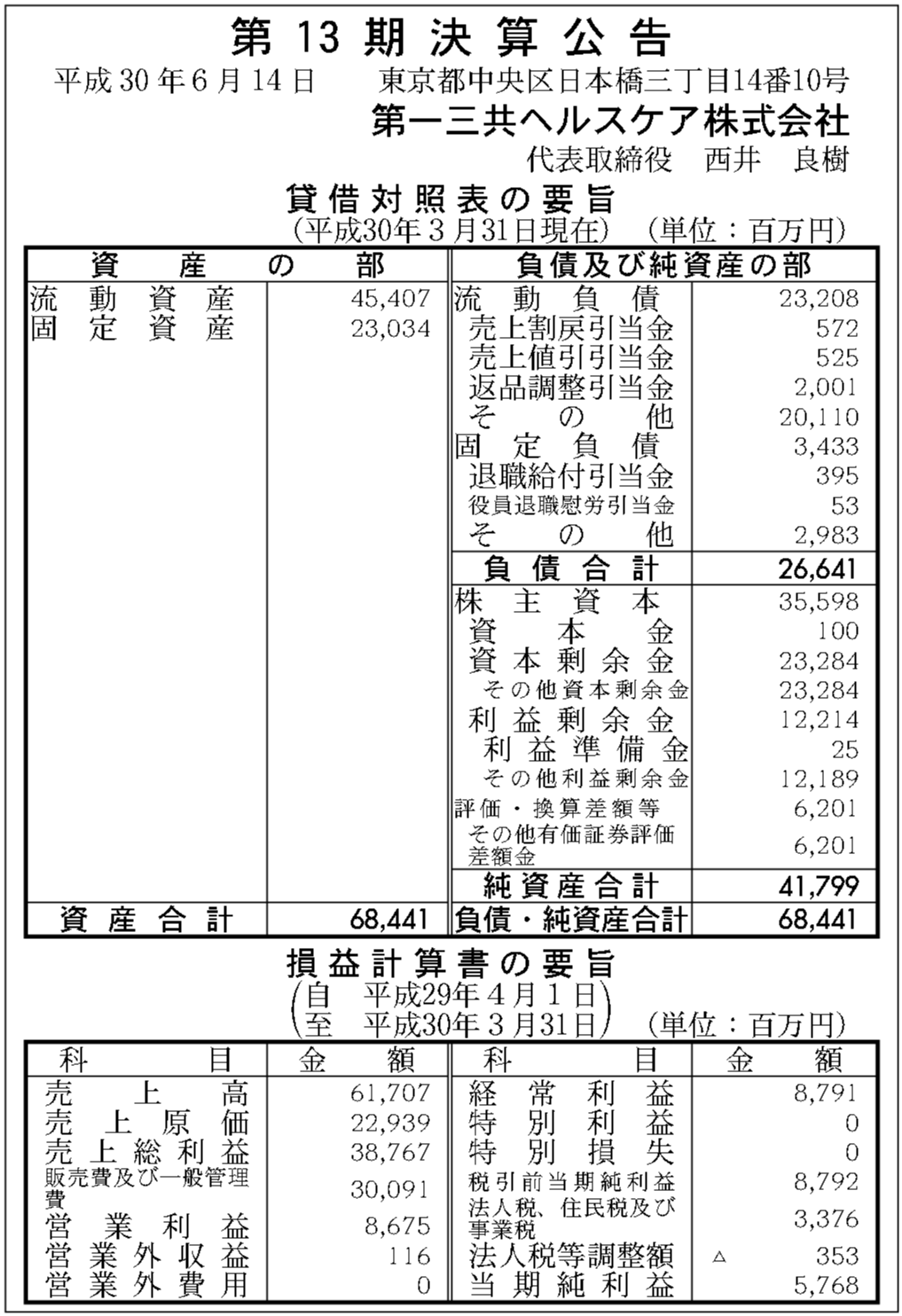 第一三共ヘルスケア株式会社の過去の決算一覧