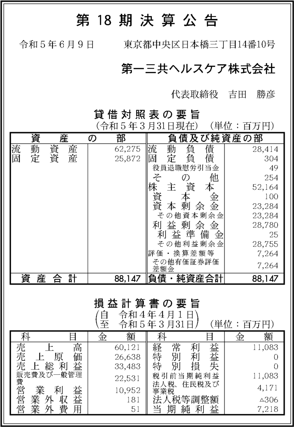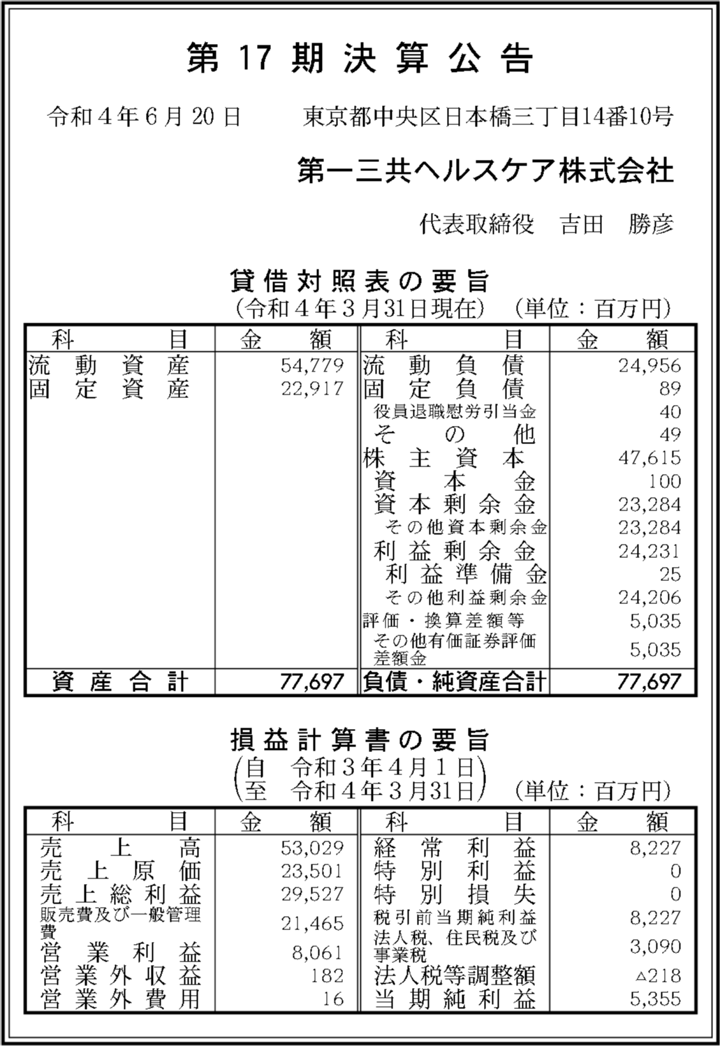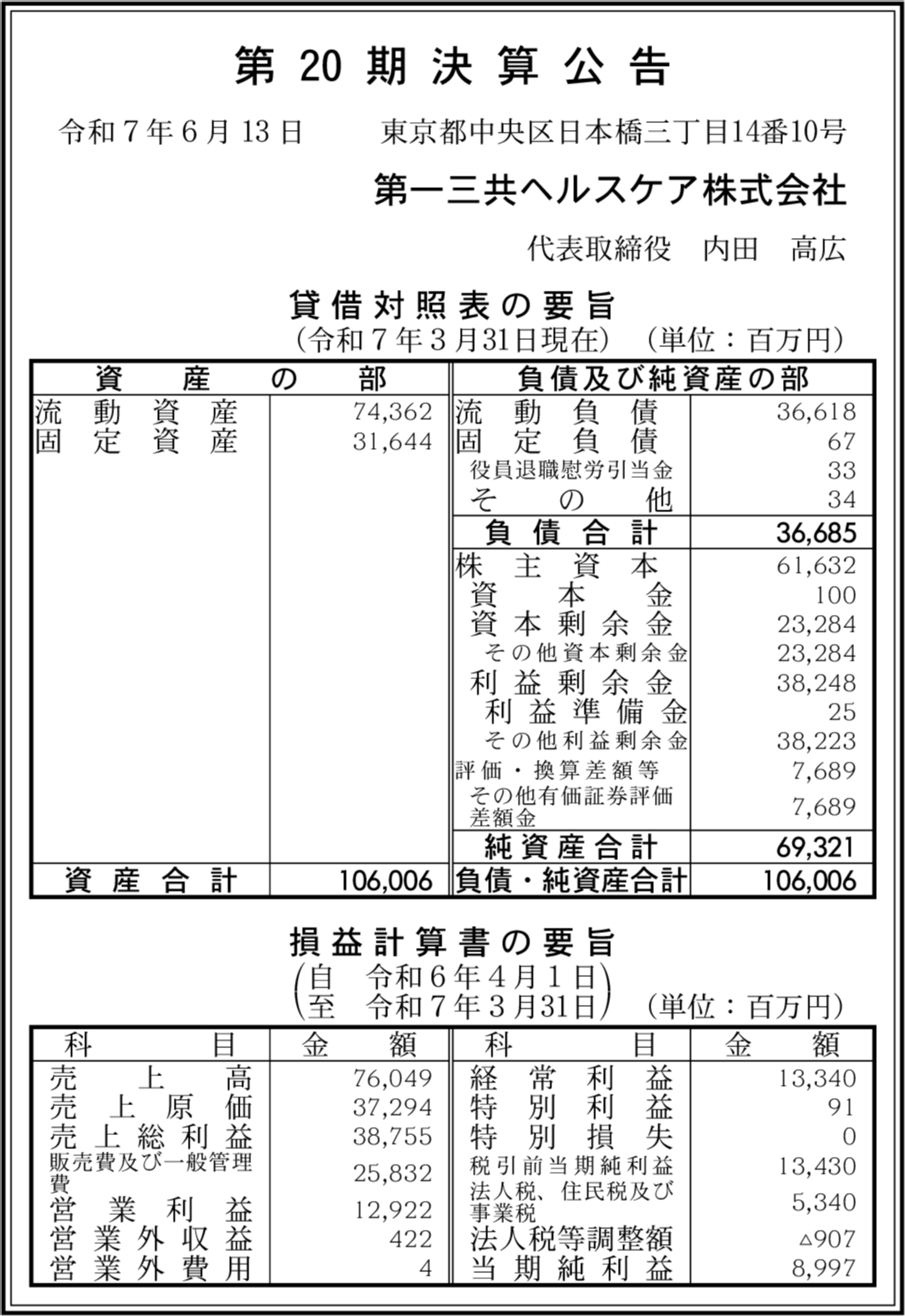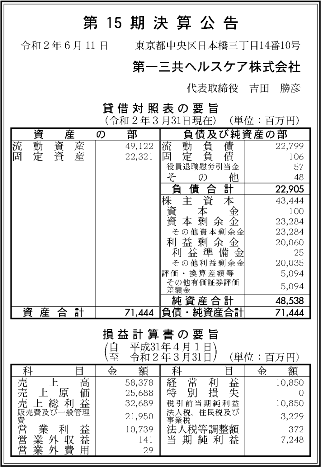 第一三共ヘルスケア株式会社の過去の決算一覧
