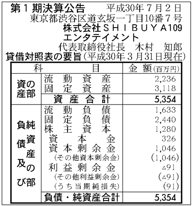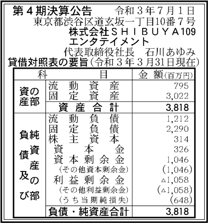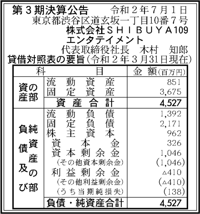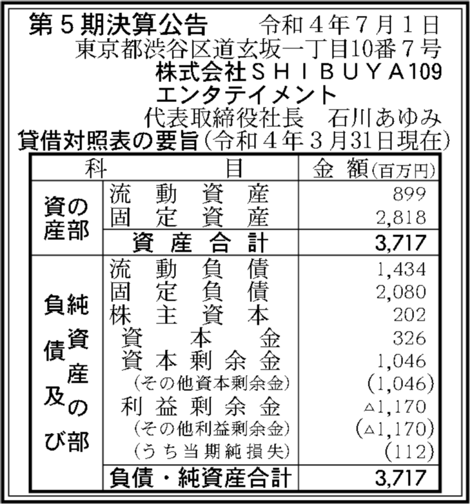株式会社SHIBUYA109エンタテイメントの過去の決算一覧
