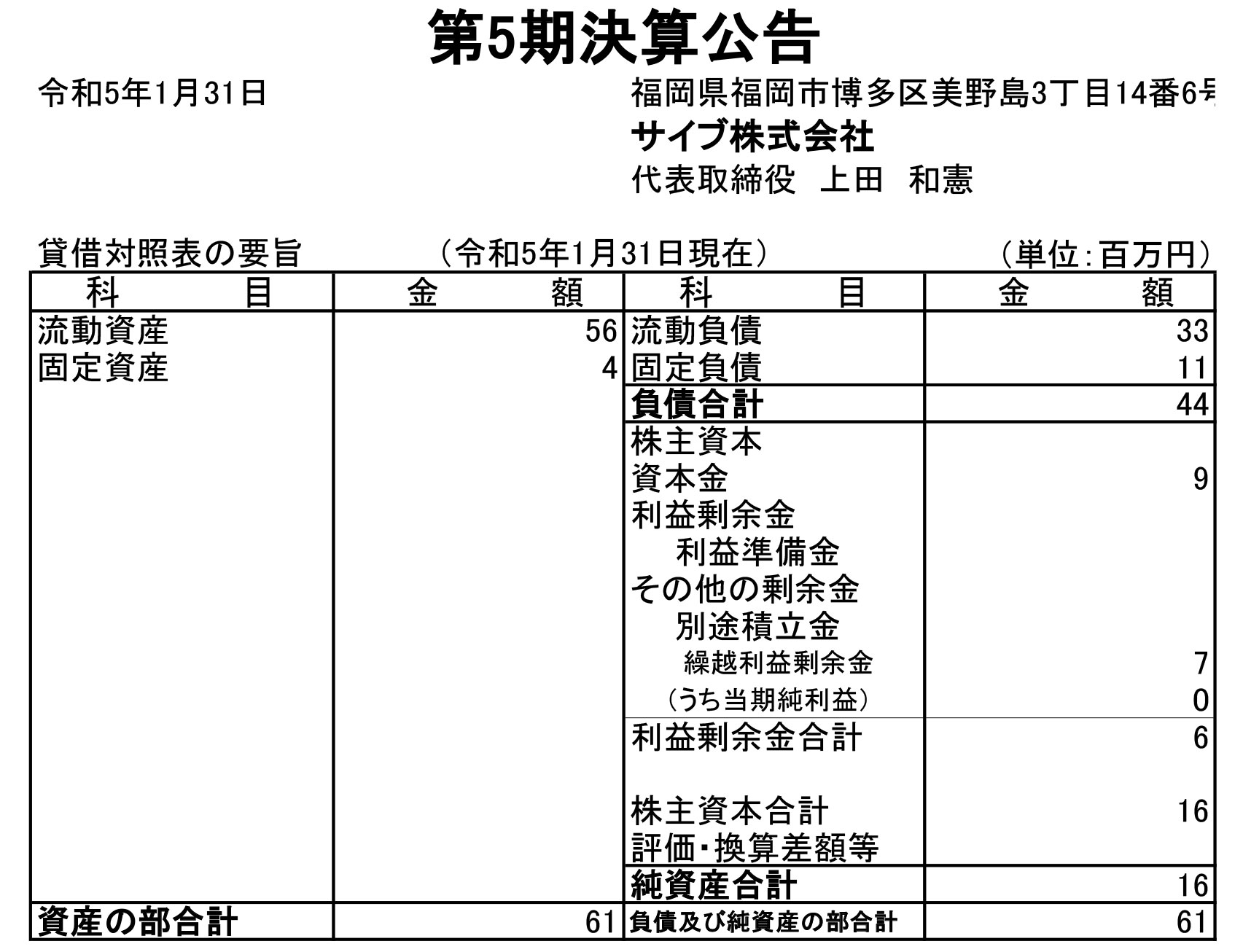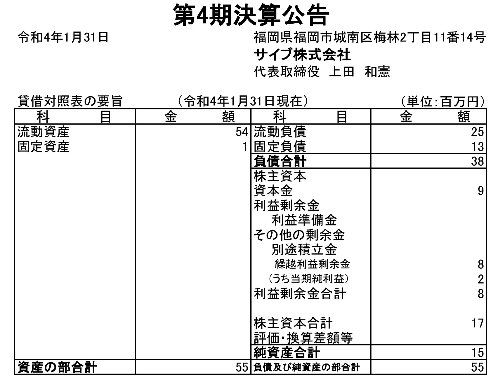 サイブ株式会社(サイブ)は、2018年2月1日設立の代表取締役 上田 和憲が社長/代表を務める福岡県福岡市博多区美野島3丁目14番6号に所在する法人です(法人番号: 8290001080435)。最終登記更新は2022/09/02で、所在地変更を実施しました。2025年1月期の決算(当期純利益: 100万円)を掲載しています。
