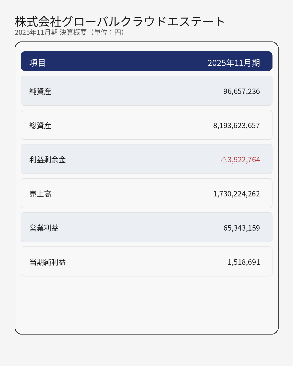 2025年11月期の決算(売上: 17億3022万4262円、当期純利益: 151万8691円)を掲載しています。