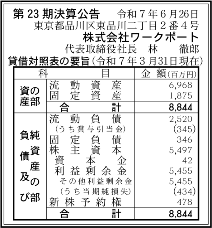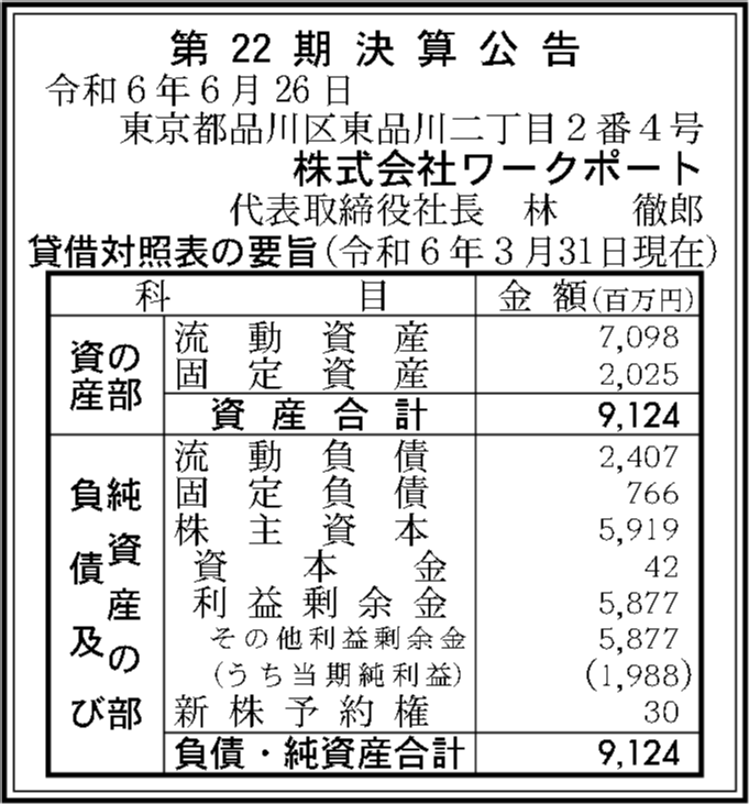株式会社ワークポート(ワークポート)は、2003年3月設立の林徹郎が社長/代表を務める東京都品川区東品川2丁目2番4号に所在する法人です(法人番号: 9010701016178)。最終登記更新は2024/04/09で、吸収合併を実施しました。