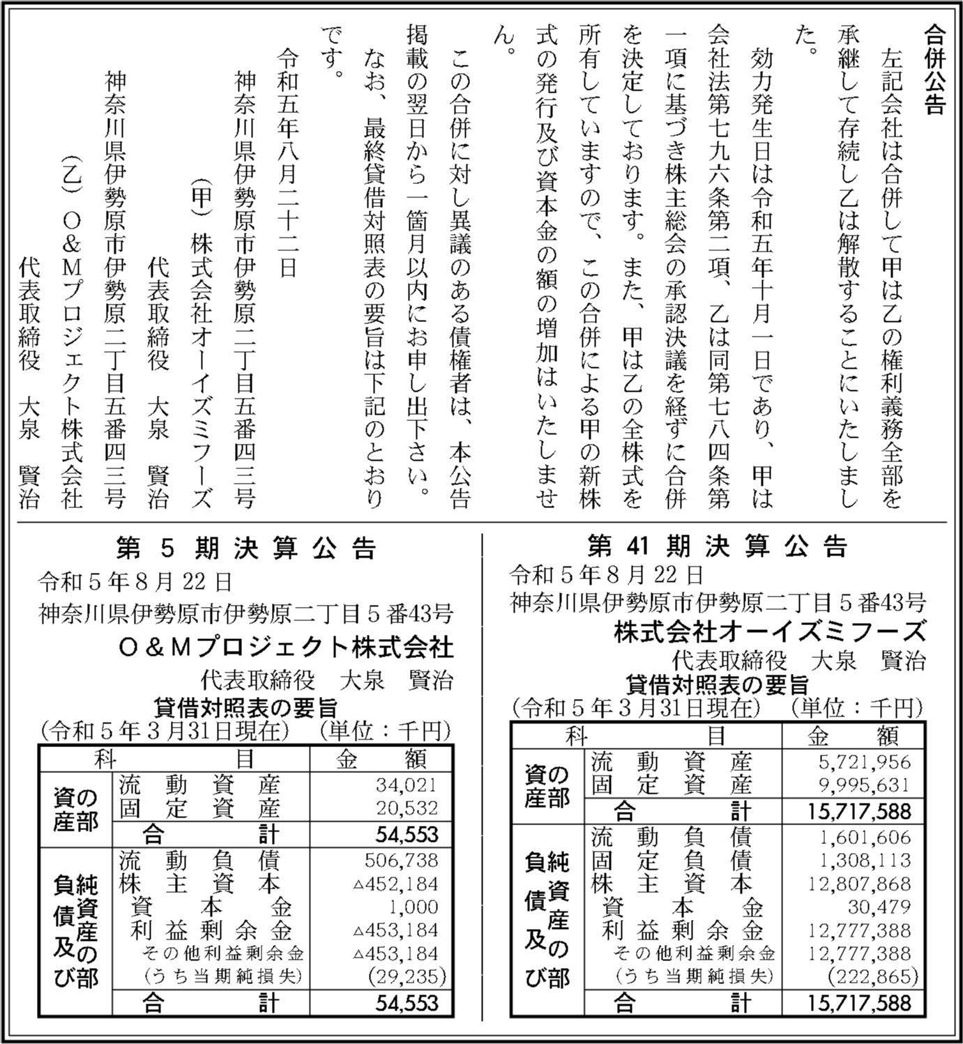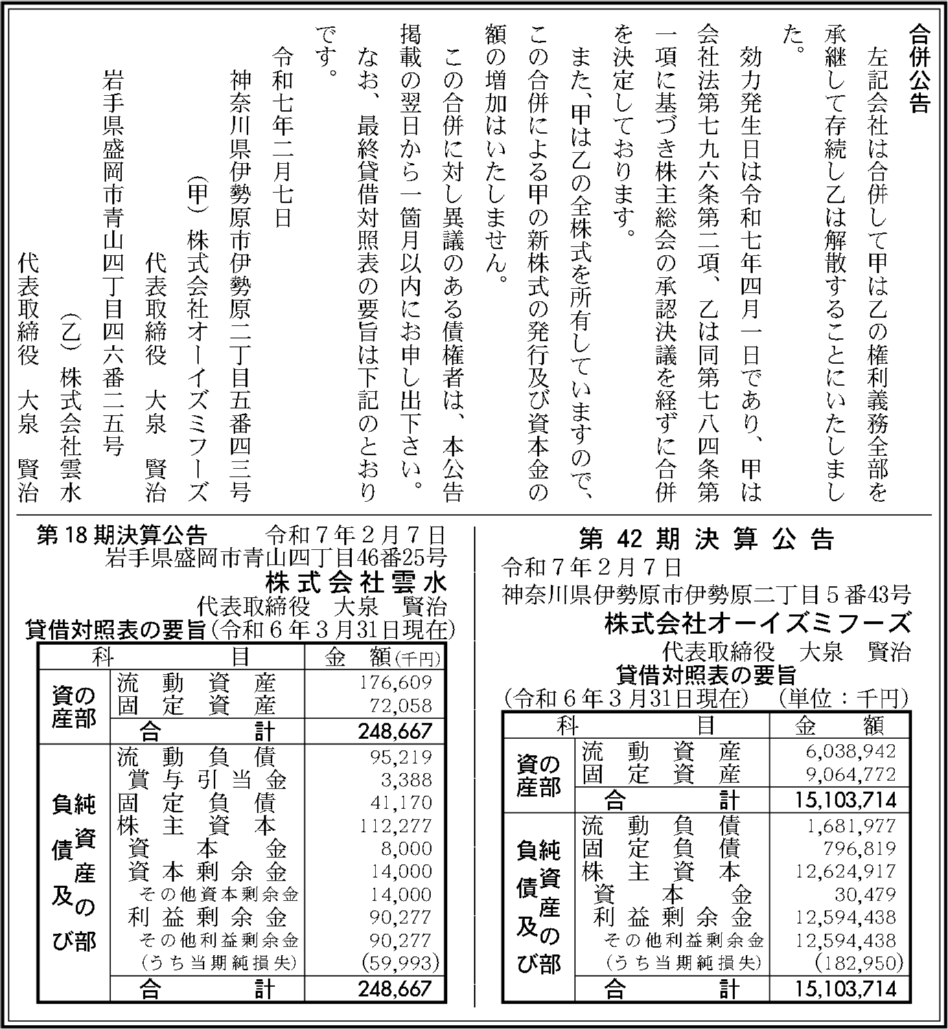 株式会社オーイズミフーズ(オーイズミフーズ)は、1982年12月設立の大泉賢治が社長/代表を務める神奈川県伊勢原市伊勢原2丁目5番43号に所在する法人です(法人番号: 9021001020992)。最終登記更新は2025/04/01で、吸収合併を実施しました。